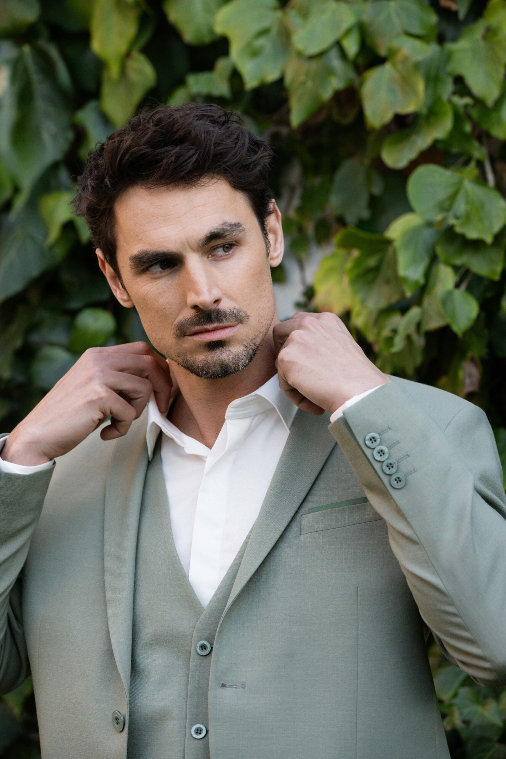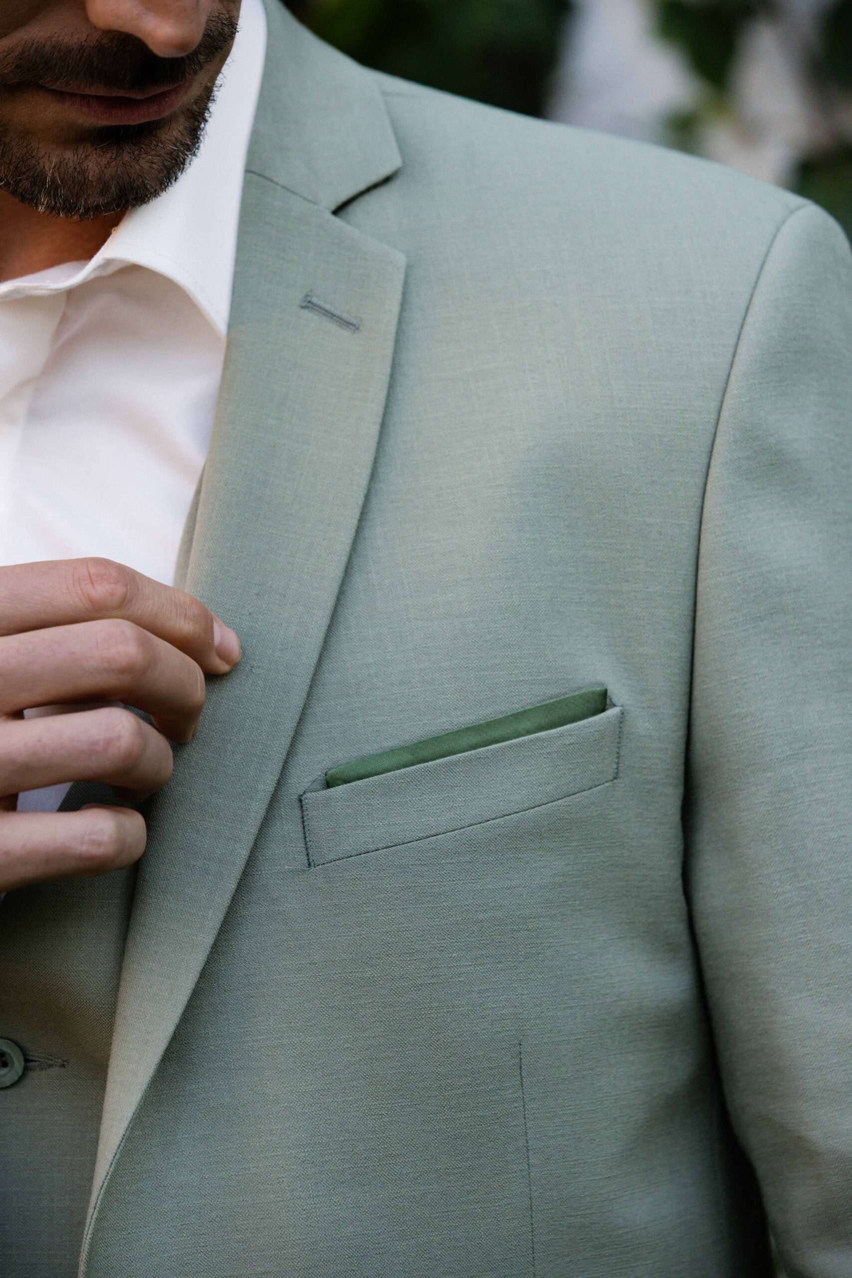Costume 3 pièces vert sauge au style doux et moderne, parfait pour un mariage naturel.