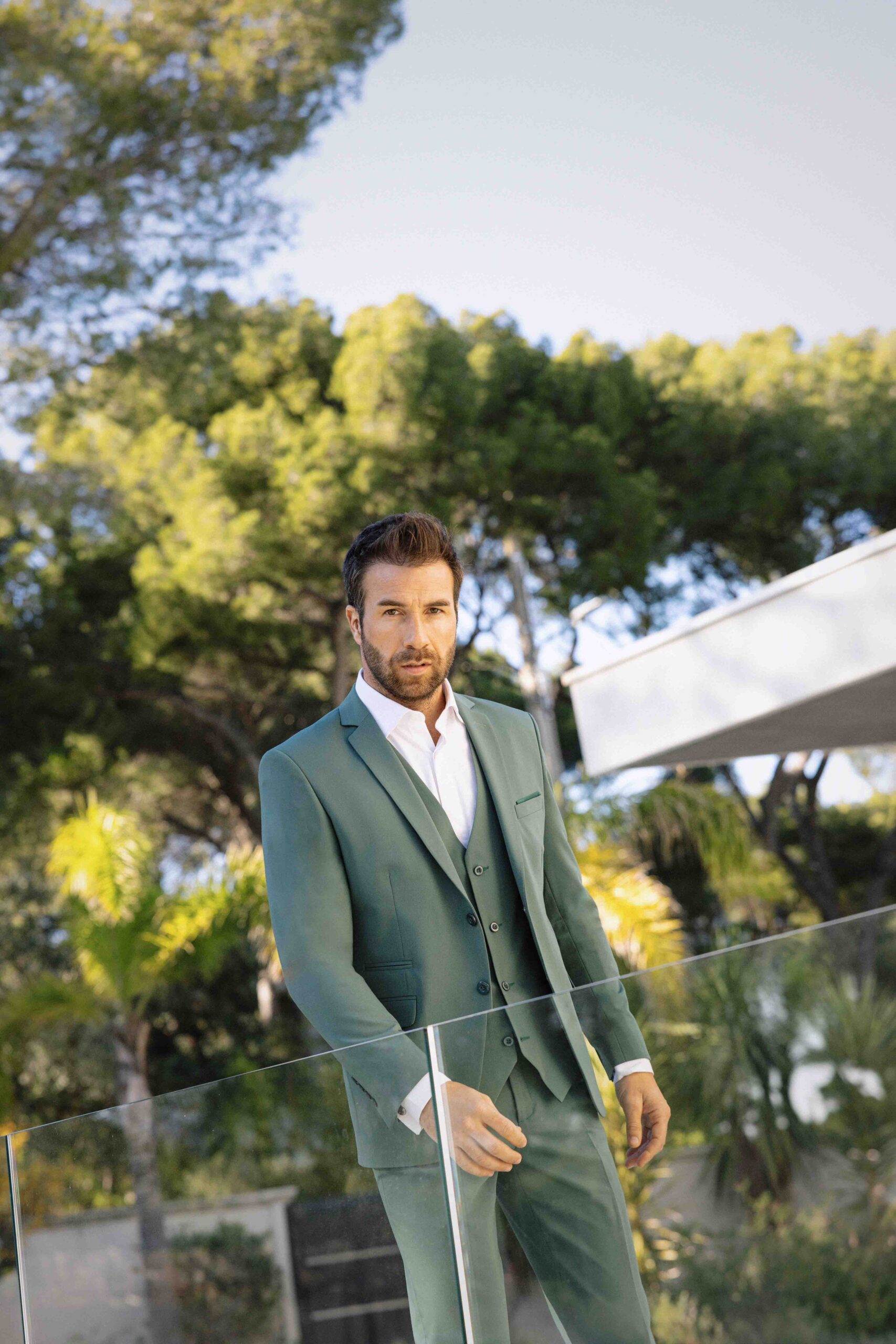 Costume 3 pièces vert chlorophylle au style doux et moderne.