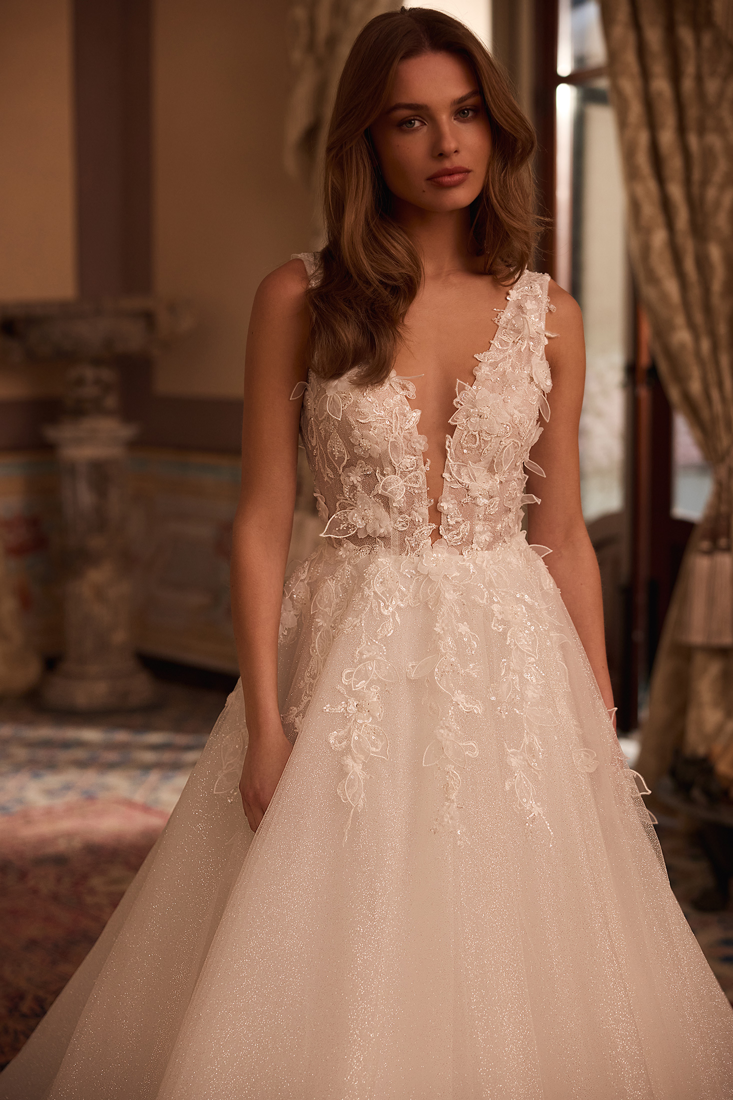 Alber d’Aria Bride est une robe princesse qui fait tourner les regards dès le premier instant. Entièrement pailletée, elle offre un effet “waouh” étincelant, tandis que le décolleté profond et le jeu subtil de dentelle et de sequins ajoutent raffinement et élégance. Sa silhouette majestueuse et lumineuse célèbre la féminité et transforme chaque pas de la mariée en un moment magique. Une robe parfaite pour celles qui rêvent d’un mariage glamour et inoubliable.