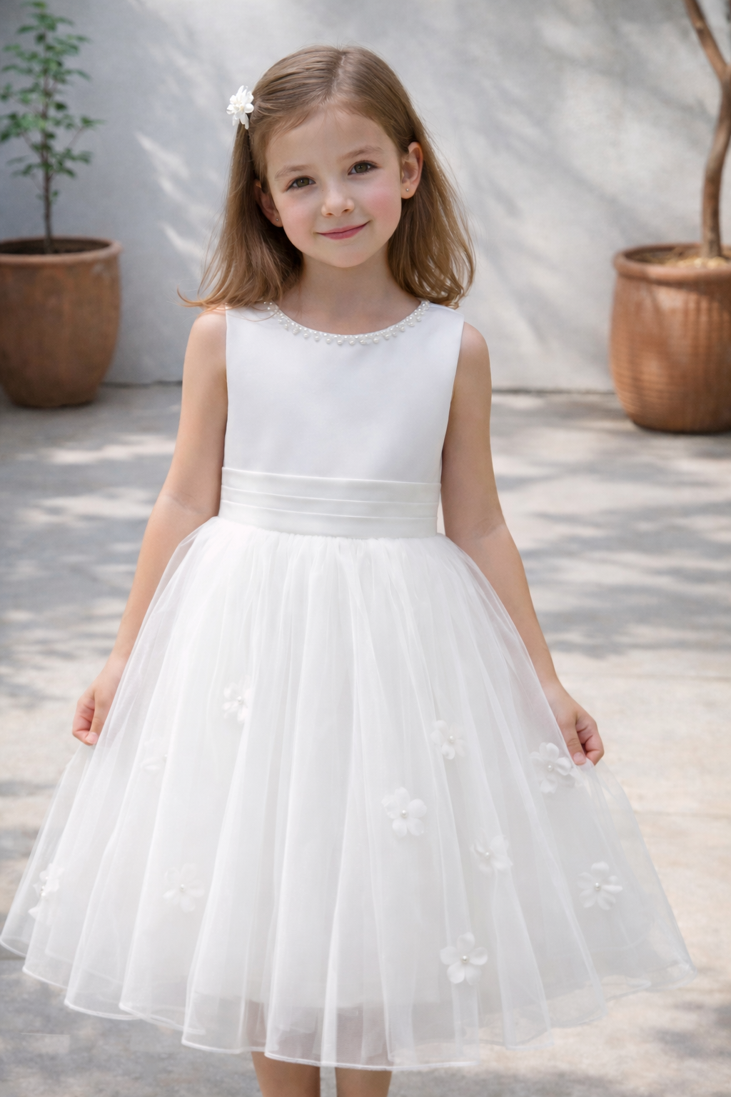 Alice enchante par sa jupe en tulle léger parsemée de fleurs 3D délicates. Son encolure finement perlée apporte une touche précieuse, pour une silhouette douce et poétique, idéale pour accompagner les plus beaux instants avec grâce et innocence.