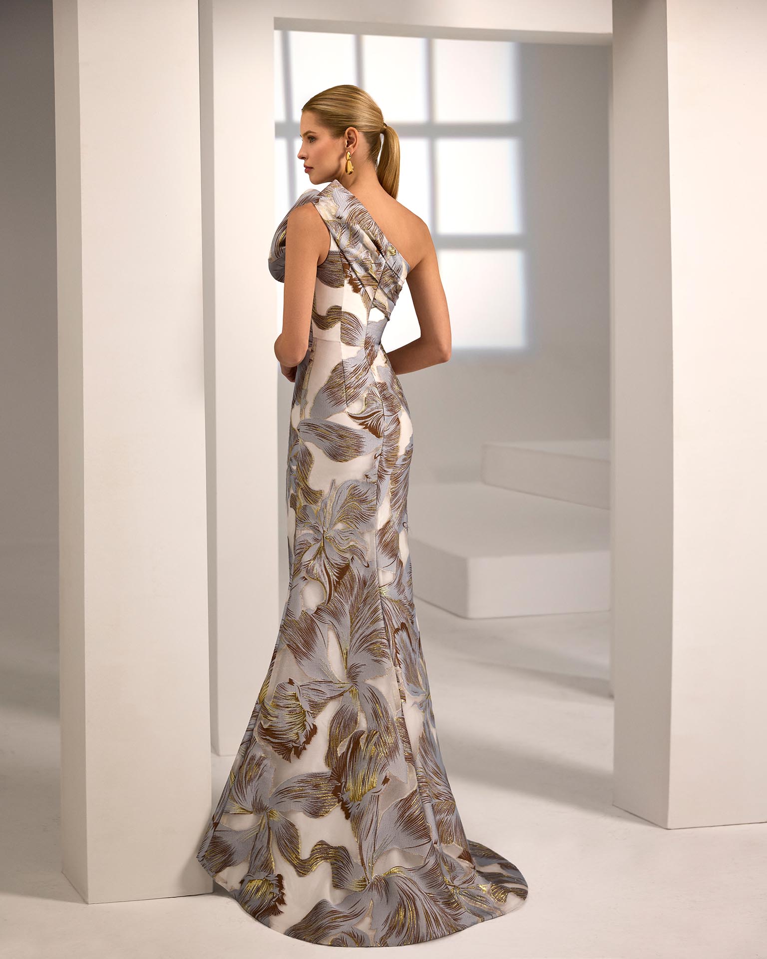 Robe longue brocart à encolure asymétrique plissée, élégante et sophistiquée pour une cérémonie.