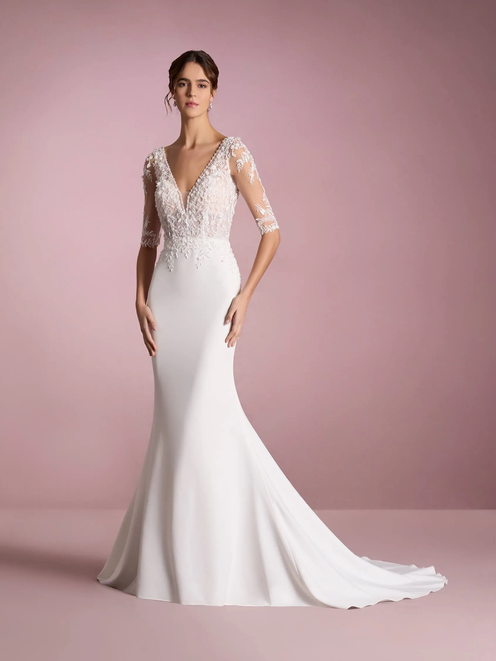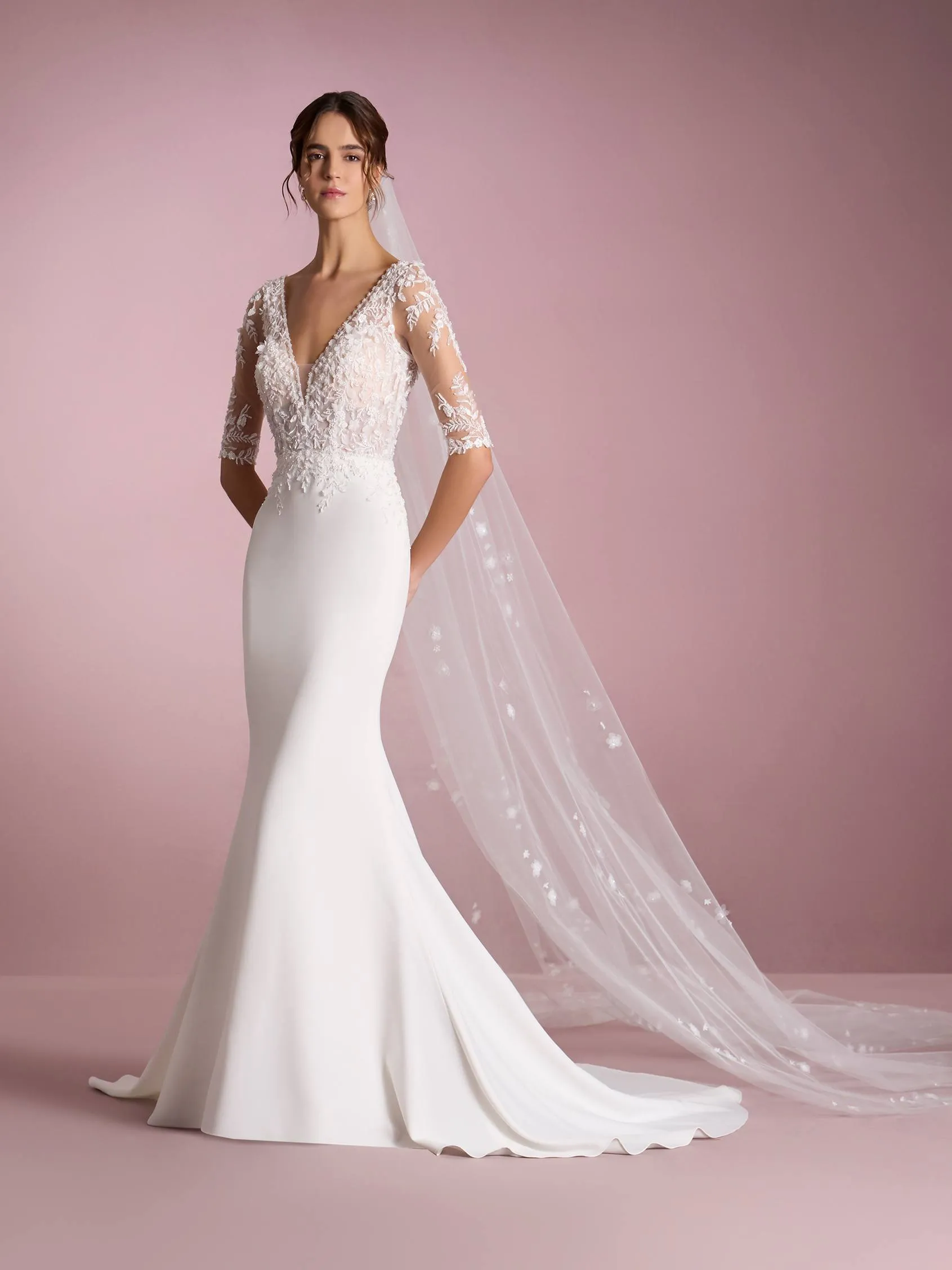 Robe sirène en crêpe avec dentelle brodée et pierreries, manches trois-quarts et dos délicatement fendu. Une silhouette élégante et raffinée.