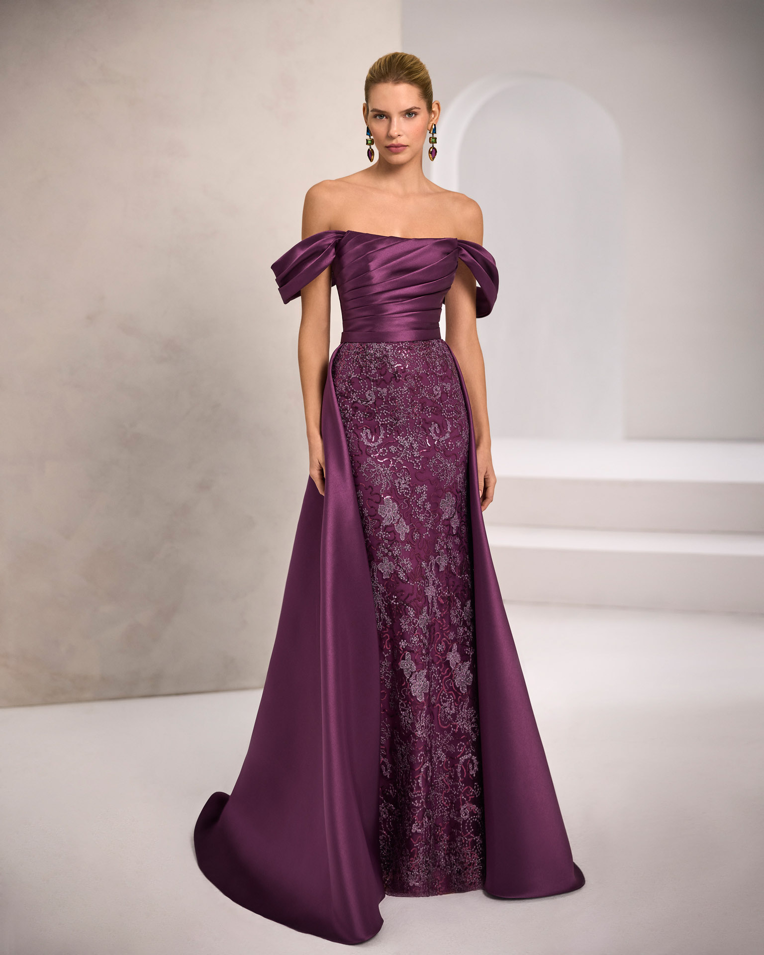 Robe de cérémonie longue deux pièces avec détails brodé et perlé, au décolleté bustier avec fines bretelles tombantes, sublimée par une surjupe vaporeuse.