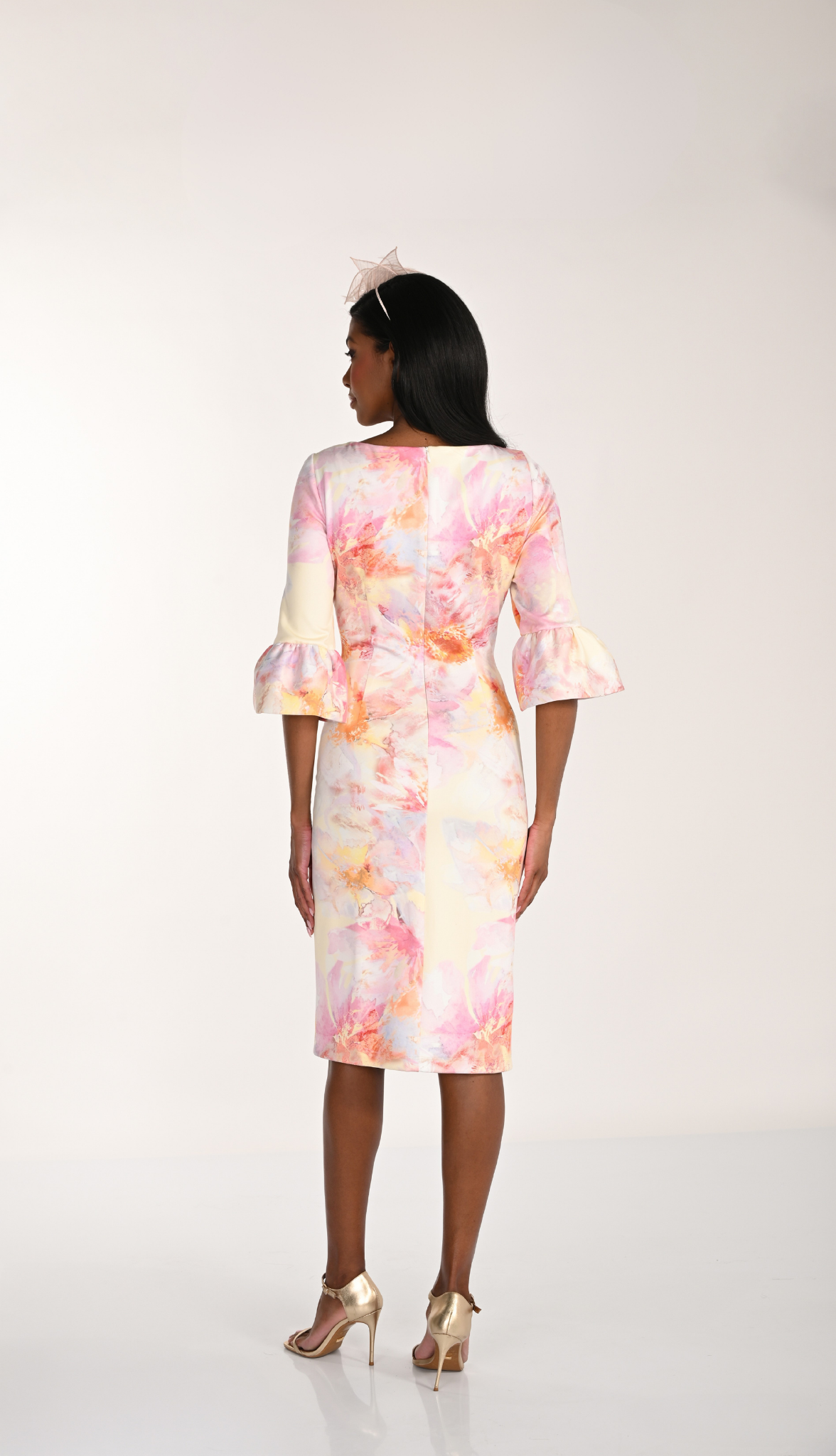 Robe mi-longue fleurie pastel avec manches 3/4 à volants, idéale pour mariage et cérémonie élégante.