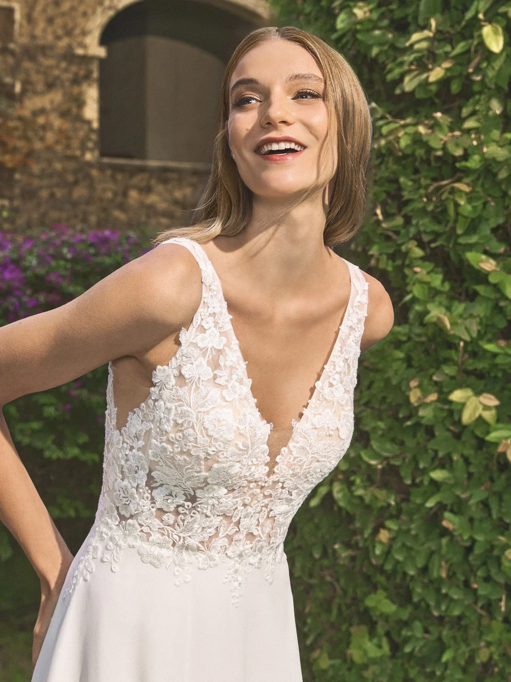 Robe de mariée Bebel, fluide légèrement trapèze, décolleté V, bretelles fines, appliques de dentelle sur le haut et légères touches sur la traîne, pour une allure romantique et aérienne.