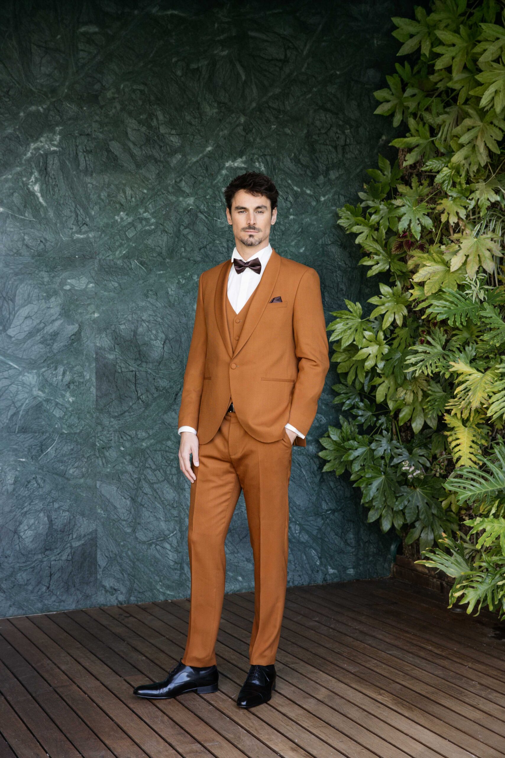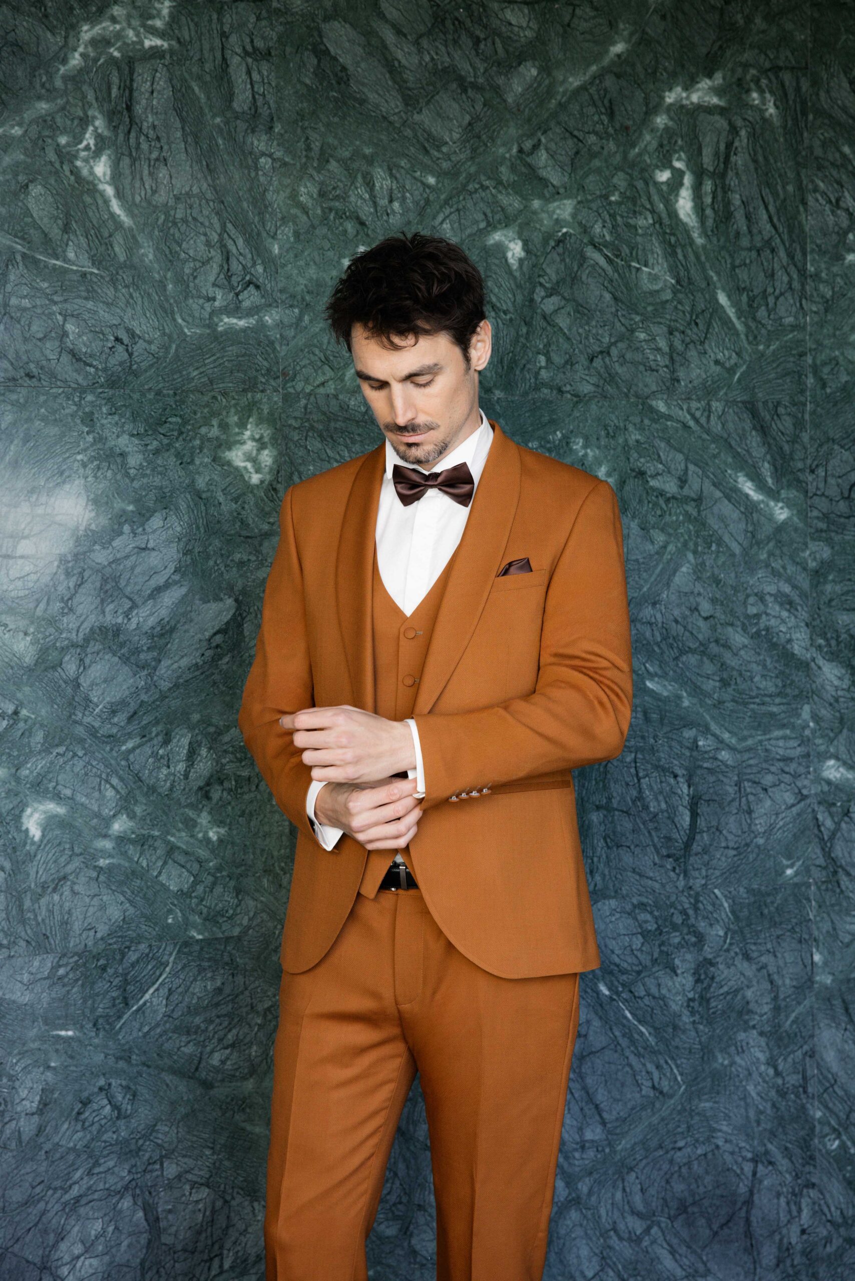 Costume de marié 3 pièces couleur rouille, au style élégant et contemporain, parfait pour un mariage moderne.