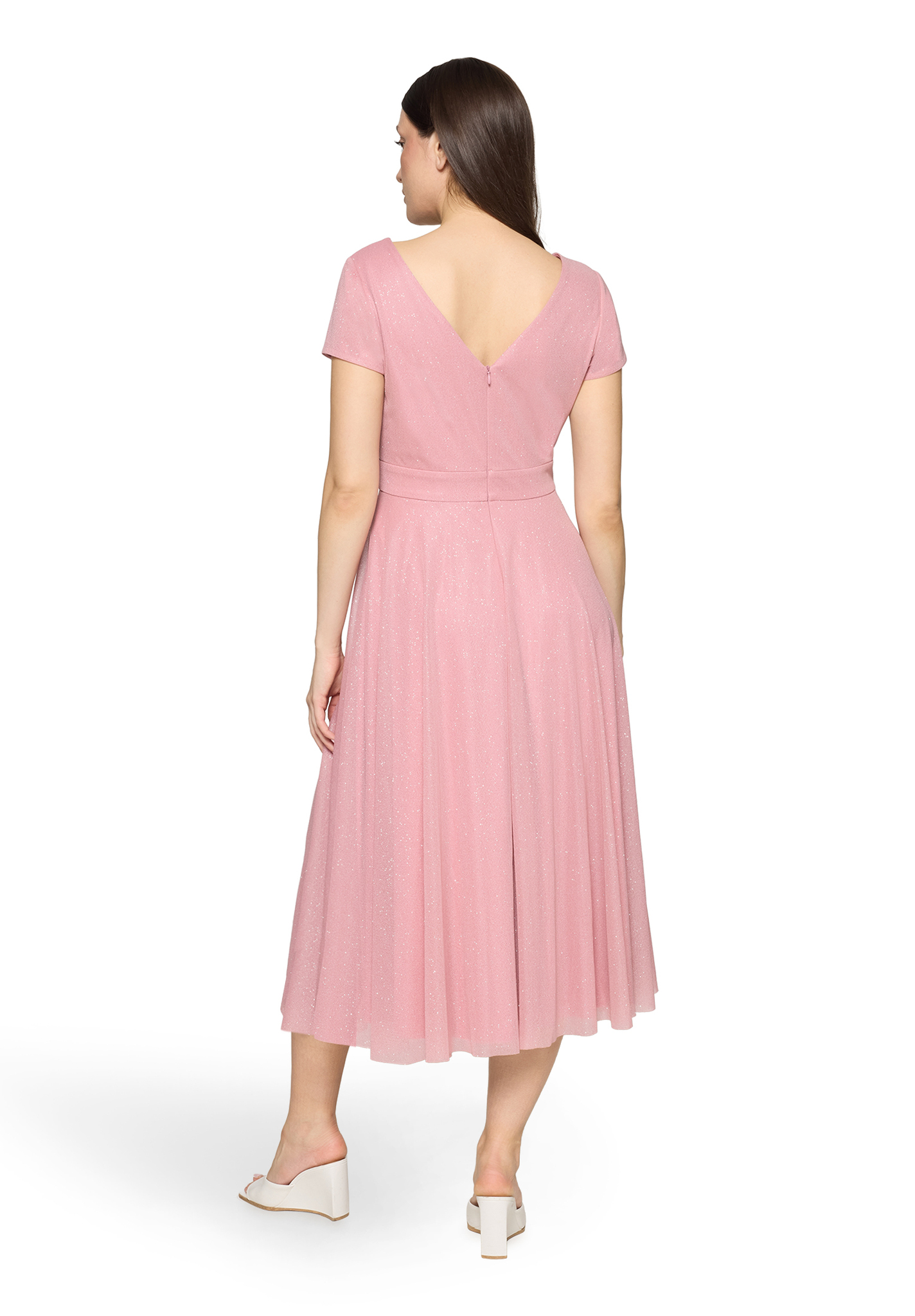 Robe midi rose pastel scintillante au décolleté croisé, idéale pour une cérémonie élégante et lumineuse.