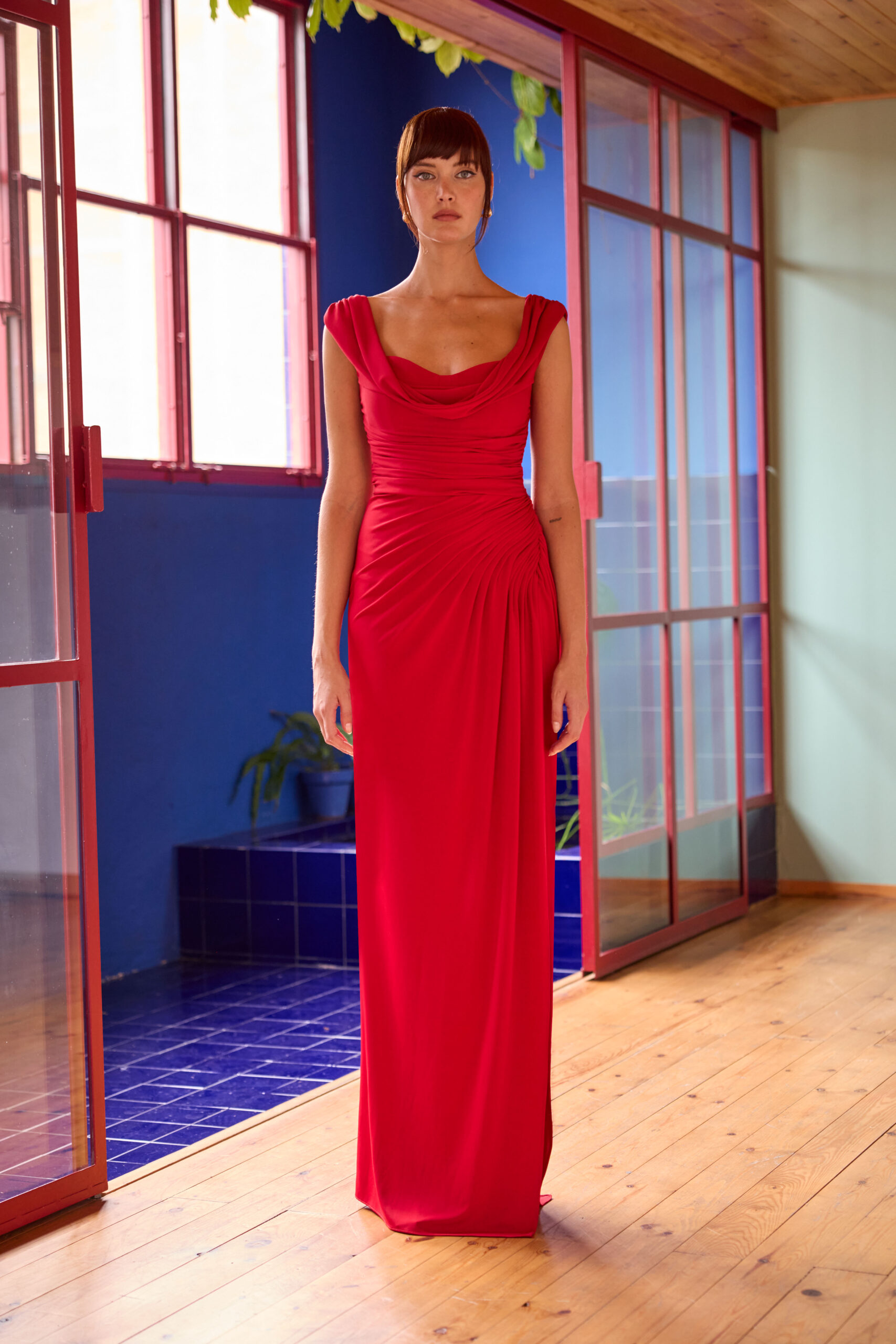 Robe de cérémonie longue aux plis délicats et décolleté drapé, pour une silhouette élégante, féminine et irrésistiblement glamour.
