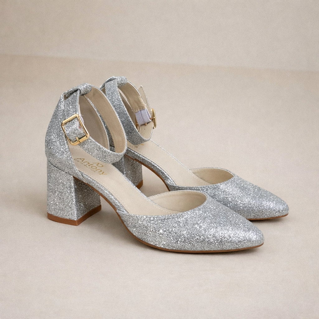 Leur bout légèrement pointu allonge la silhouette, tandis que le talon bloc assure confort et stabilité toute la journée. La finition scintillante apporte une touche lumineuse et raffinée, sublimée par une boucle dorée. Un modèle chic et féminin, idéal pour accompagner vos plus beaux moments.