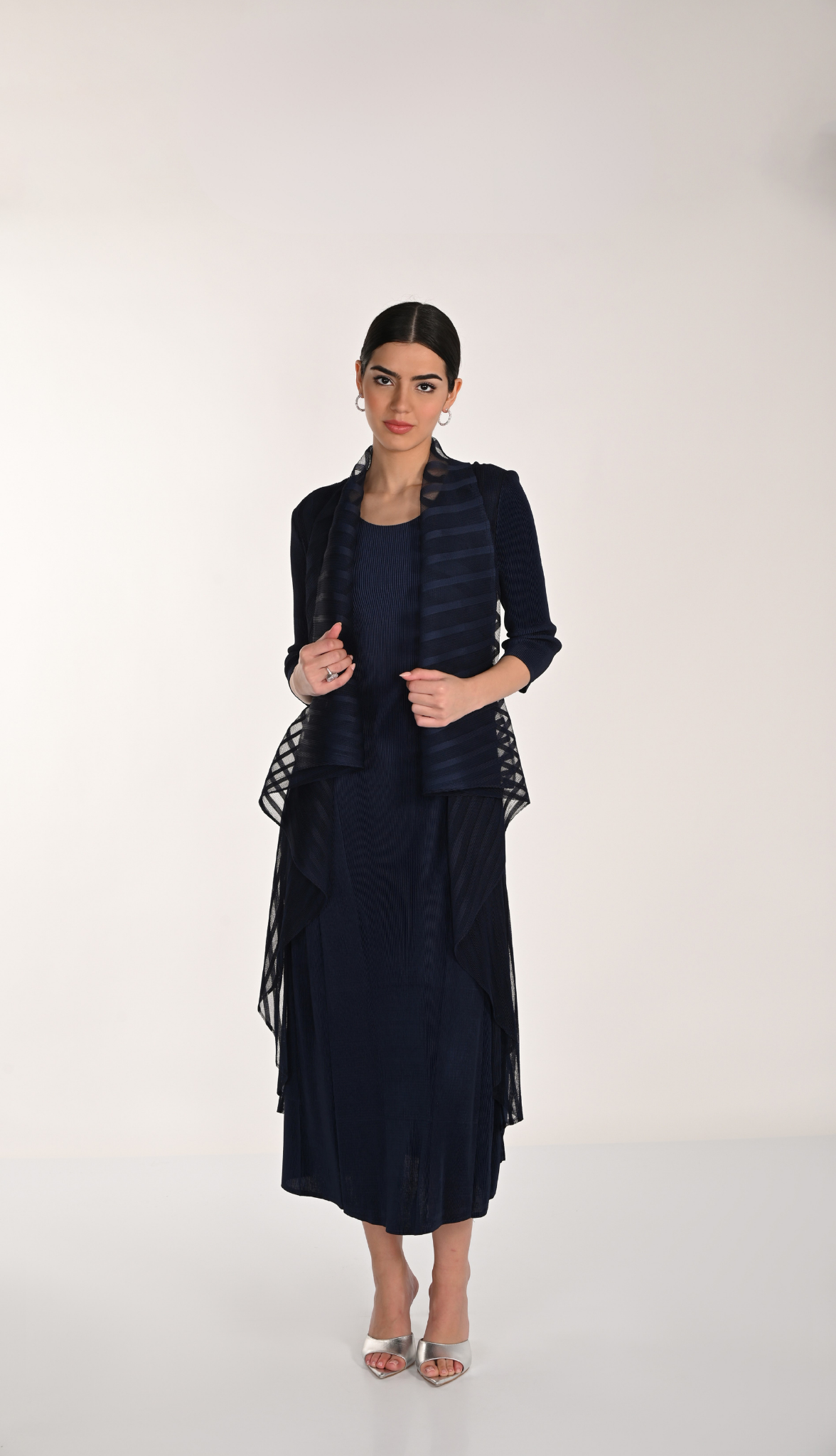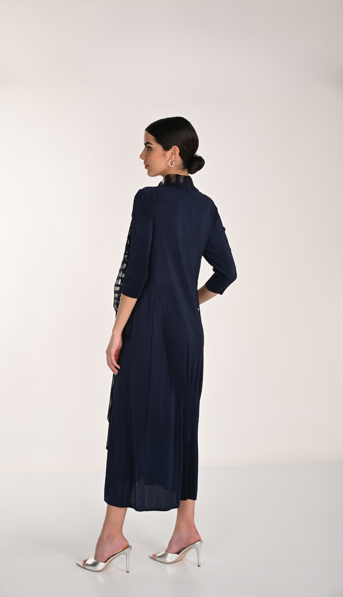 Le tissu texturé apporte de la profondeur à la tenue, tandis que les manches 3/4 offrent confort et structure. La superposition délicate en bas de robe ajoute du mouvement et une touche de modernité subtile.