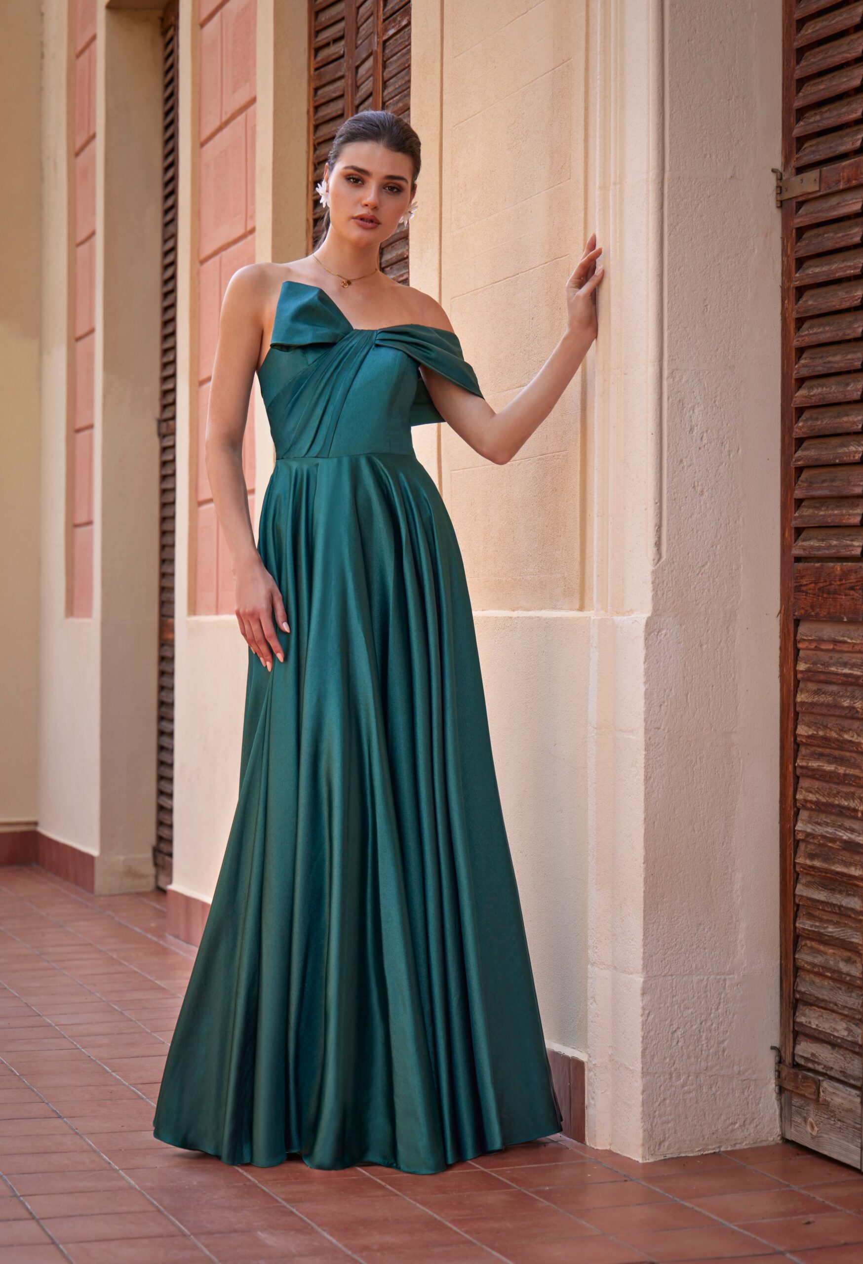 Robe de cérémonie longue asymétrique aux épaules délicatement dévoilées, sublimée par un drapé élégant et une jupe fluide pour une allure majestueuse et raffinée.