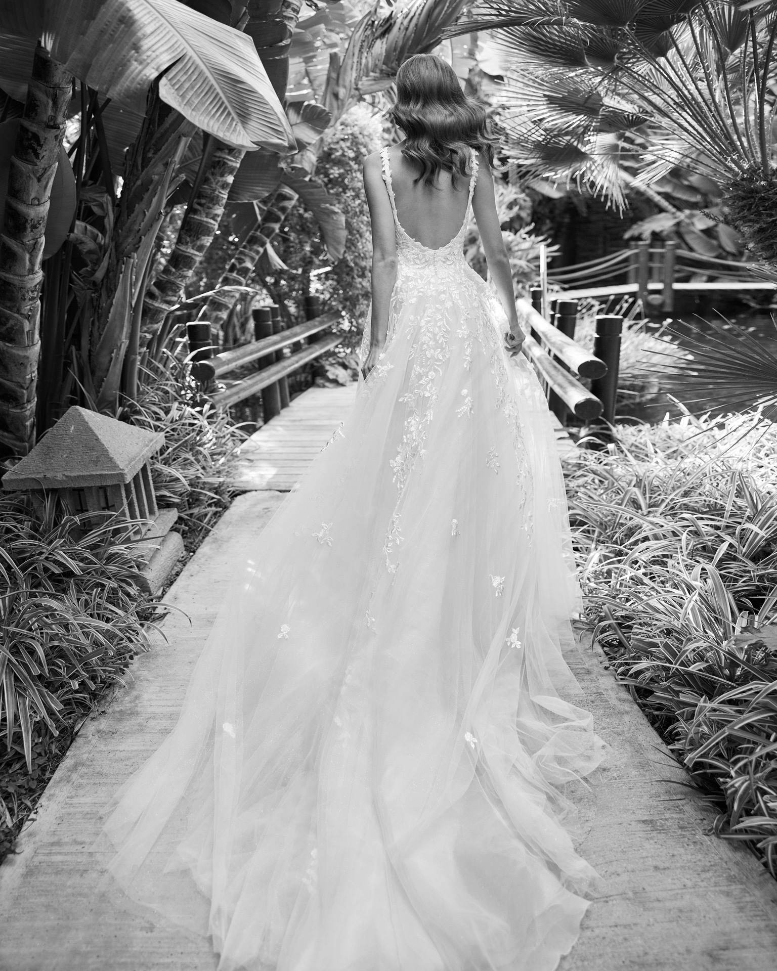 Robe de mariée ligne A style princesse, entièrement réalisée en tulle avec applications de dentelle et une couche pailletée sur la jupe, dotée d’un décolleté plongeant, d’un dos ouvert et de bretelles ornées d’applications de dentelle.