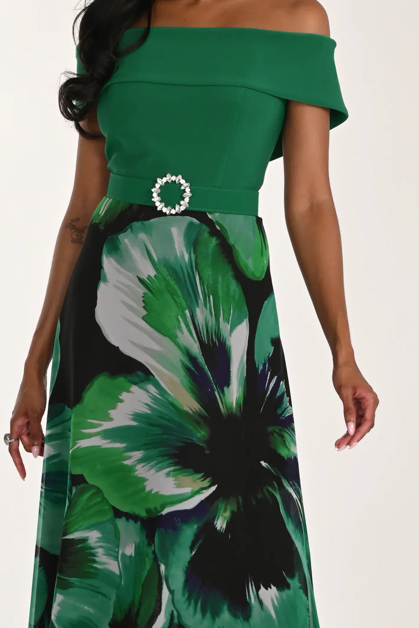 Robe cocktail longue verte Frank Lyman avec encolure épaules dénudées, ceinture bijou et jupe fluide à imprimé floral.