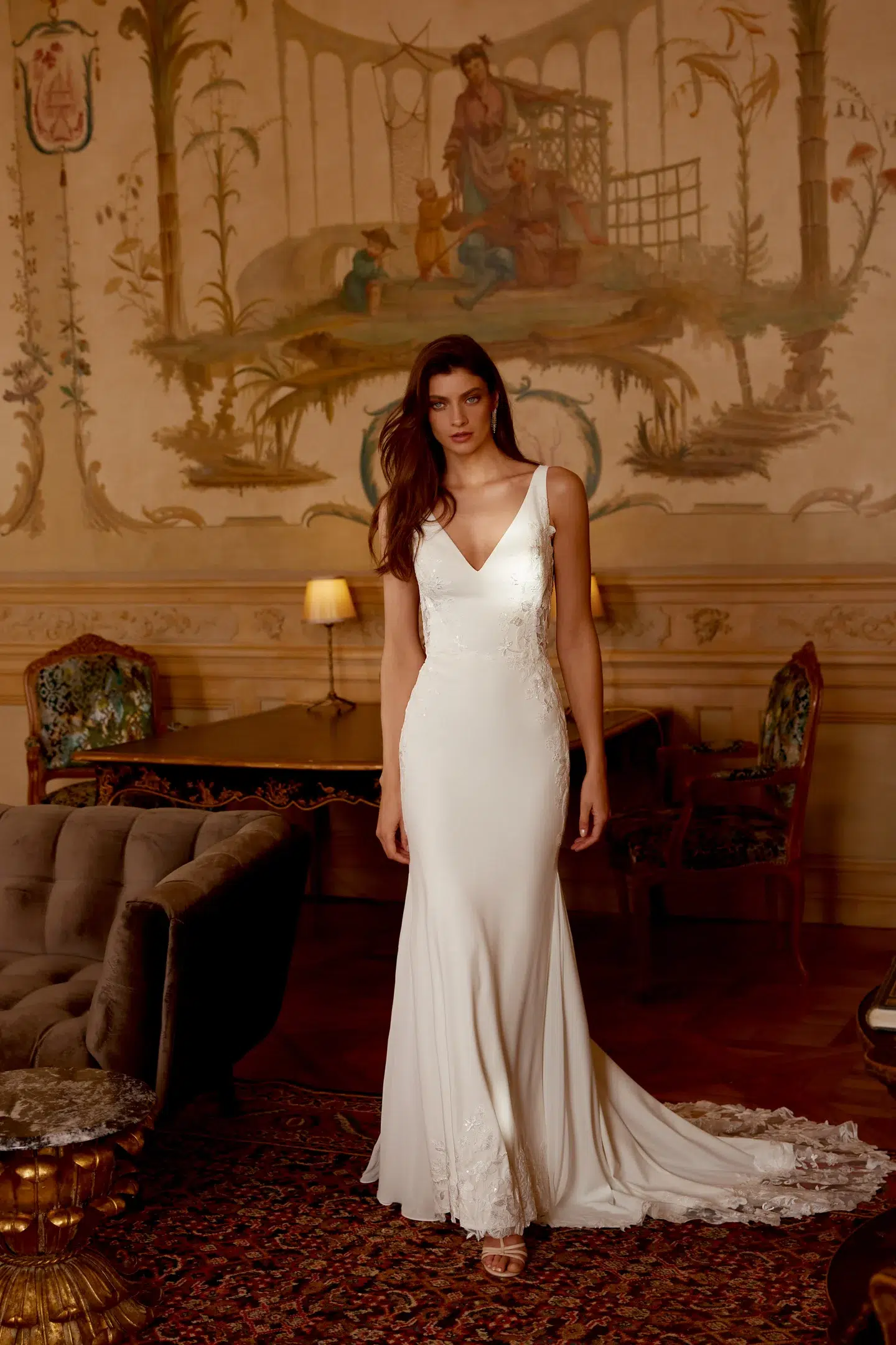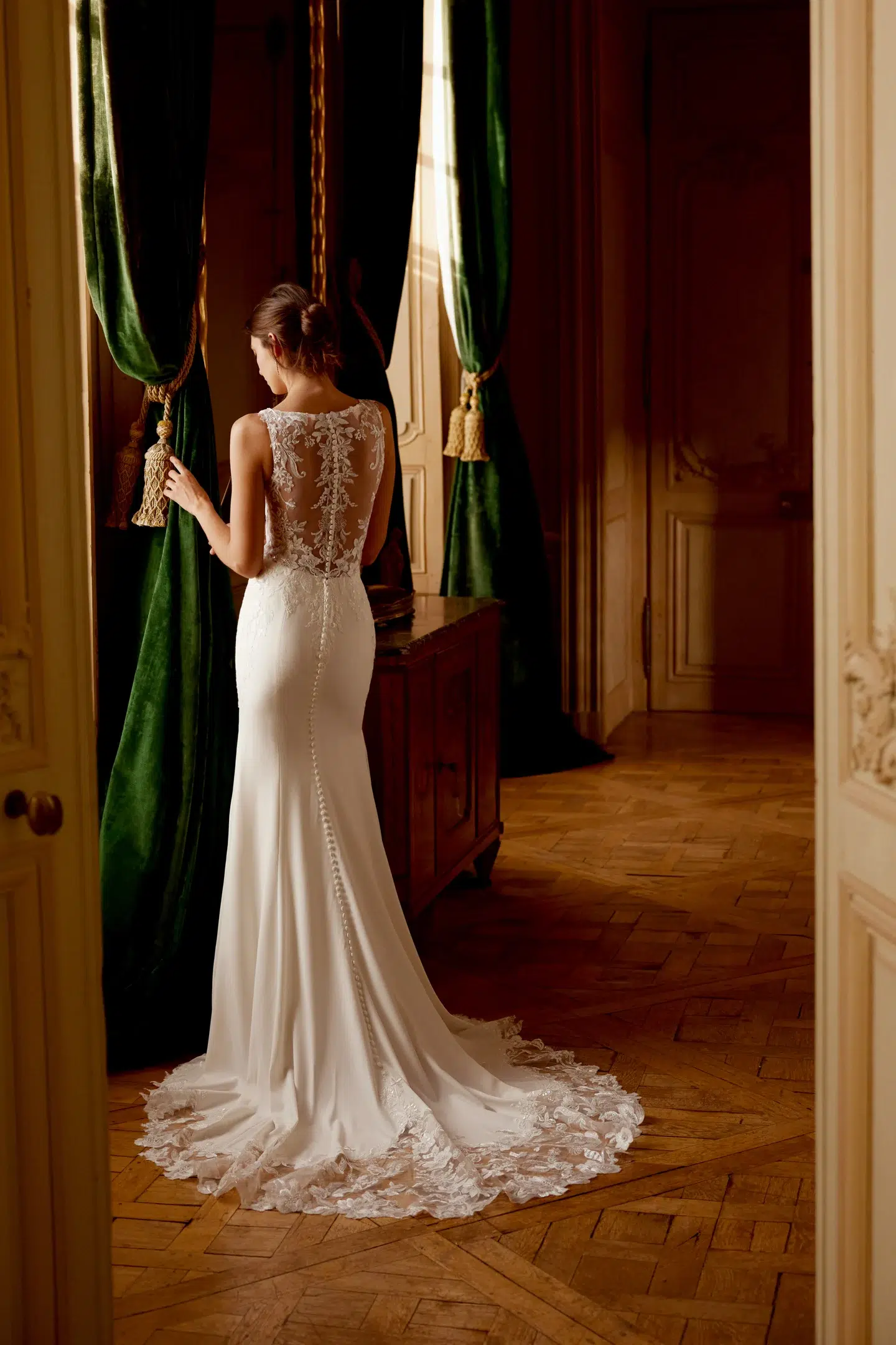 Le dos boutonné, entièrement orné de dentelle, se termine sur une traîne travaillée avec soin, pour une allure à la fois moderne, sensuelle et intemporelle.