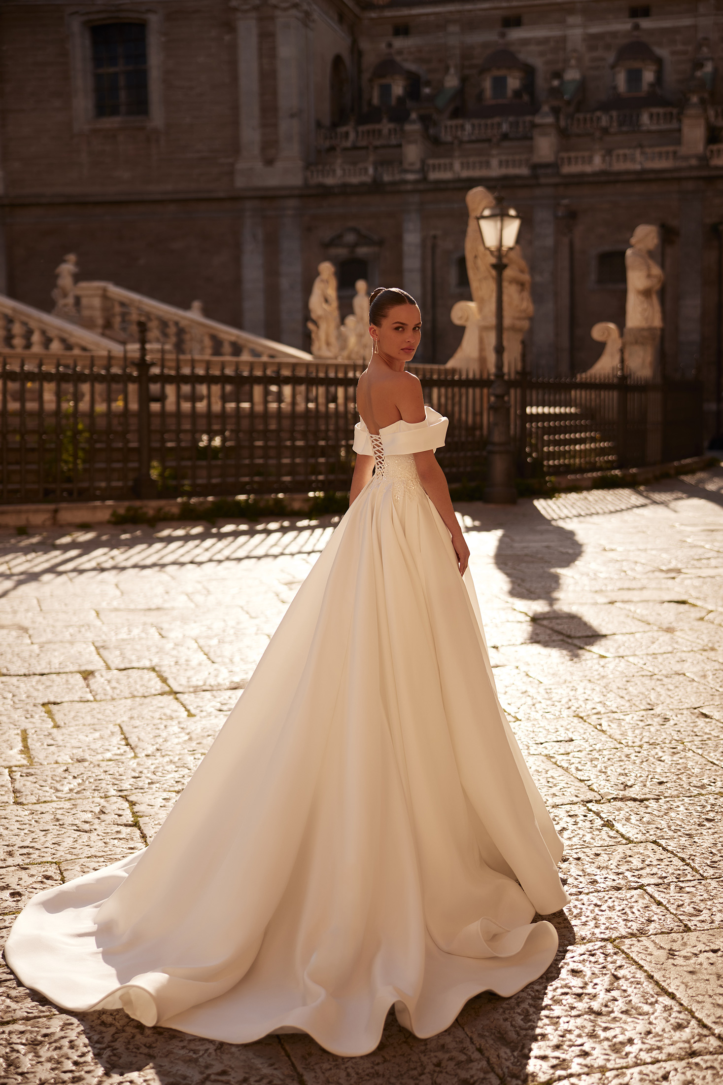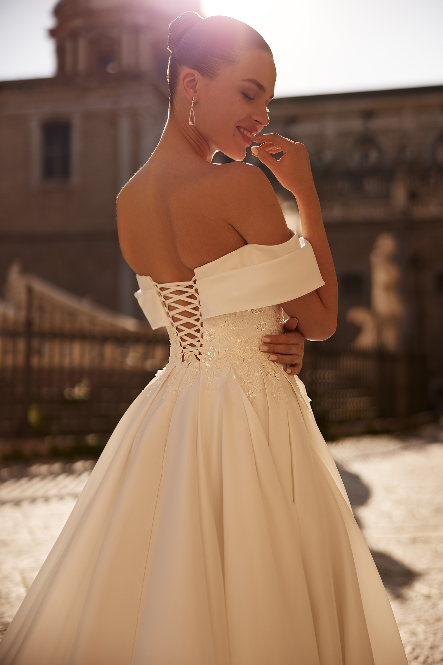 Kat d’Aria Bride est une robe de mariée qui allie élégance et modernité. Son col bardot met en valeur le port de tête et les épaules avec délicatesse, tandis que les plis subtils sur le haut et la jupe apportent mouvement et sophistication. Les appliques de dentelle au niveau de la ceinture ajoutent une touche raffinée, et la fente offre une allure fluide et aérienne à chaque pas. Une robe idéale pour les mariées qui souhaitent allier chic et légèreté le jour de leur mariage.