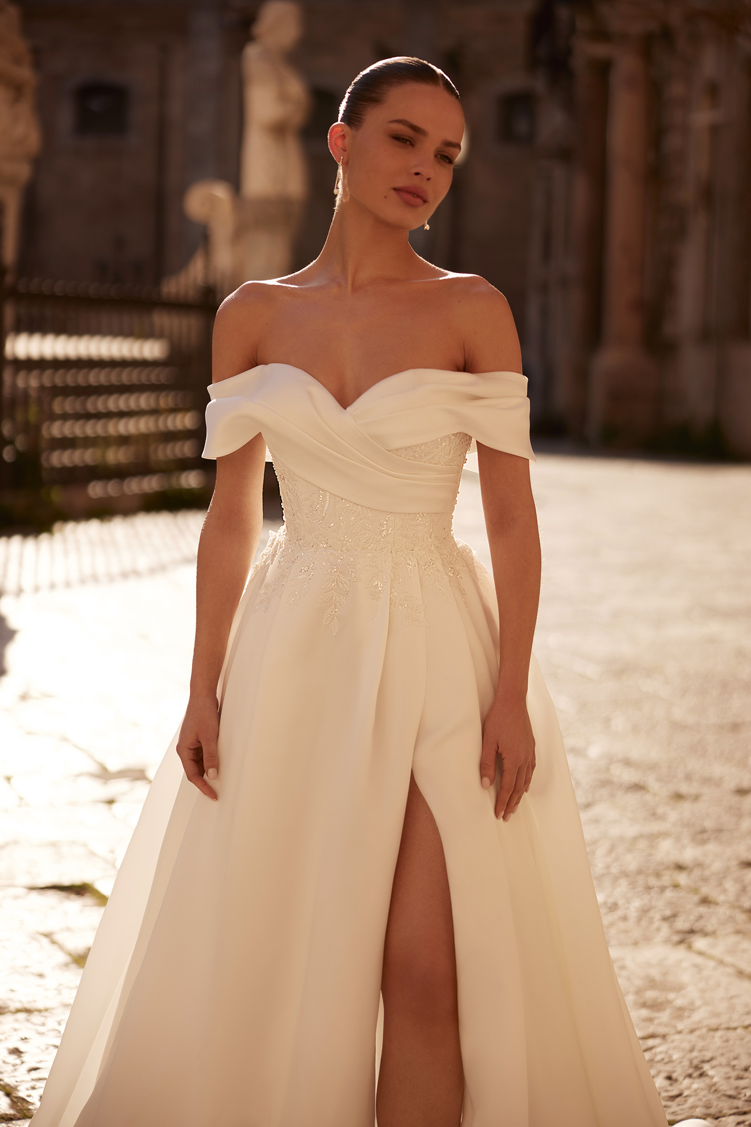 Kat d’Aria Bride, robe élégante au col bardot, plis raffinés et fente délicate, avec appliques de dentelle à la ceinture pour un style chic et aérien.