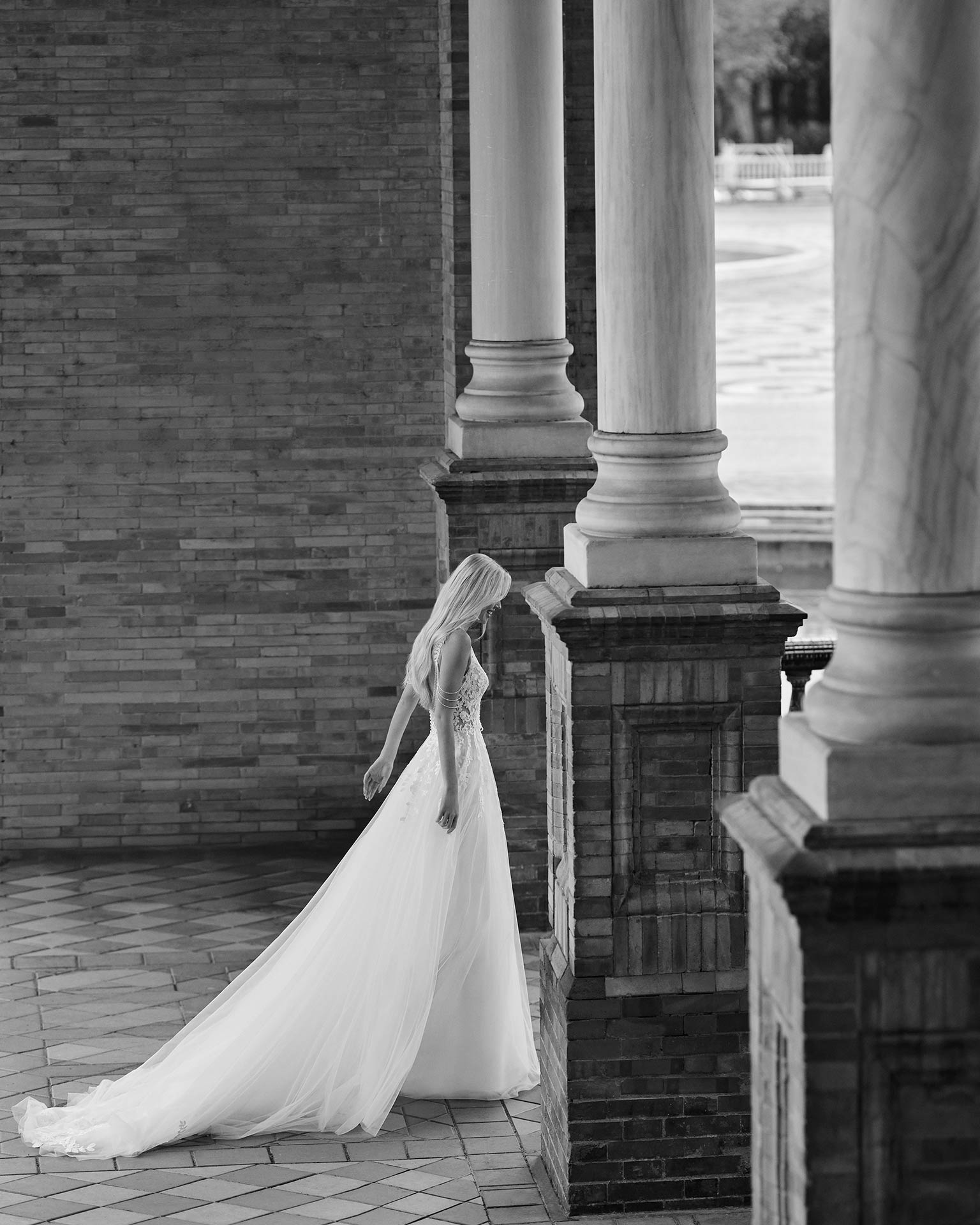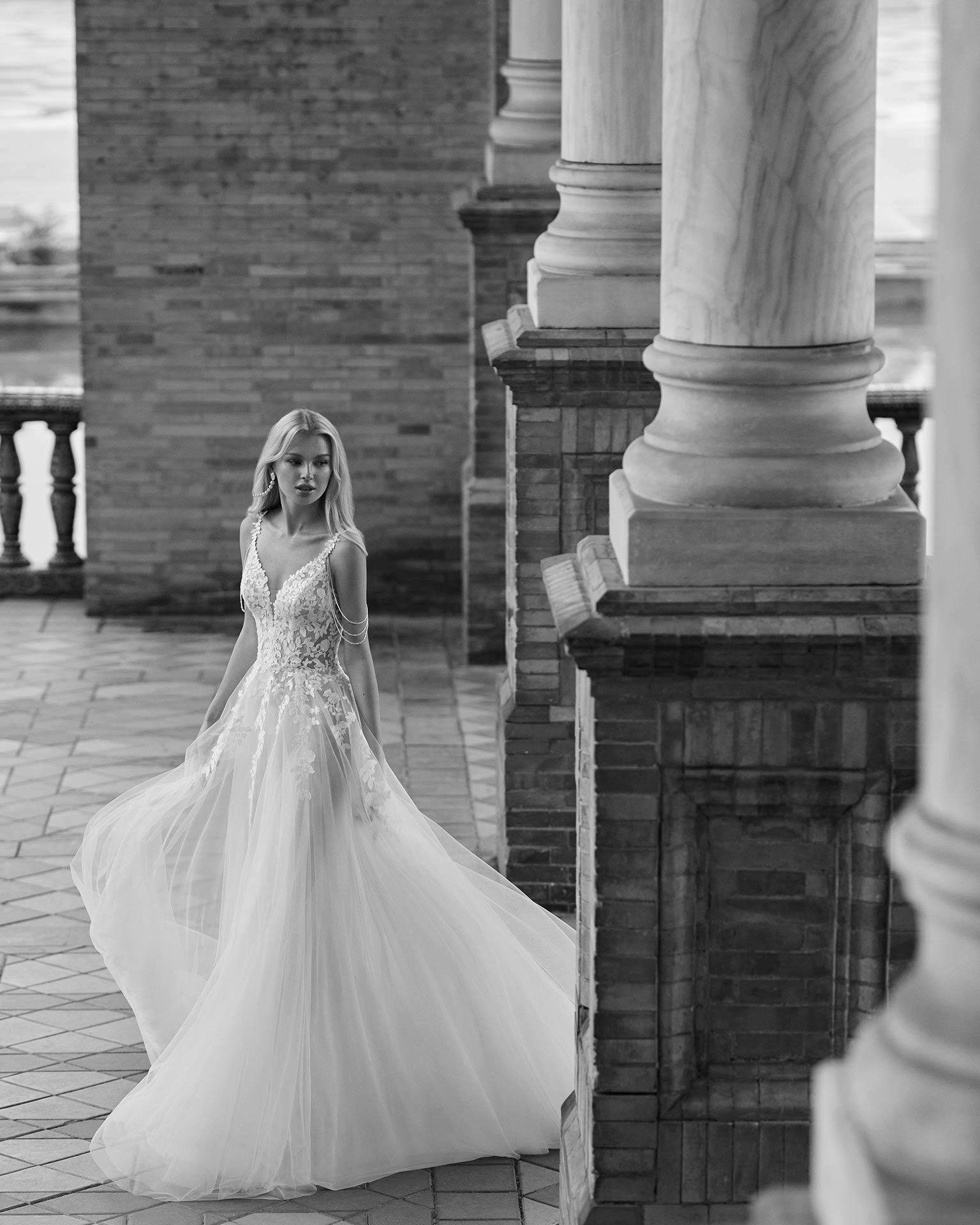 Robe de mariée, longue silhouette en ligne A. Confectionnée avec tulle, corsage en dentelle, décolleté illusion et bretelles. Dos ouvert.