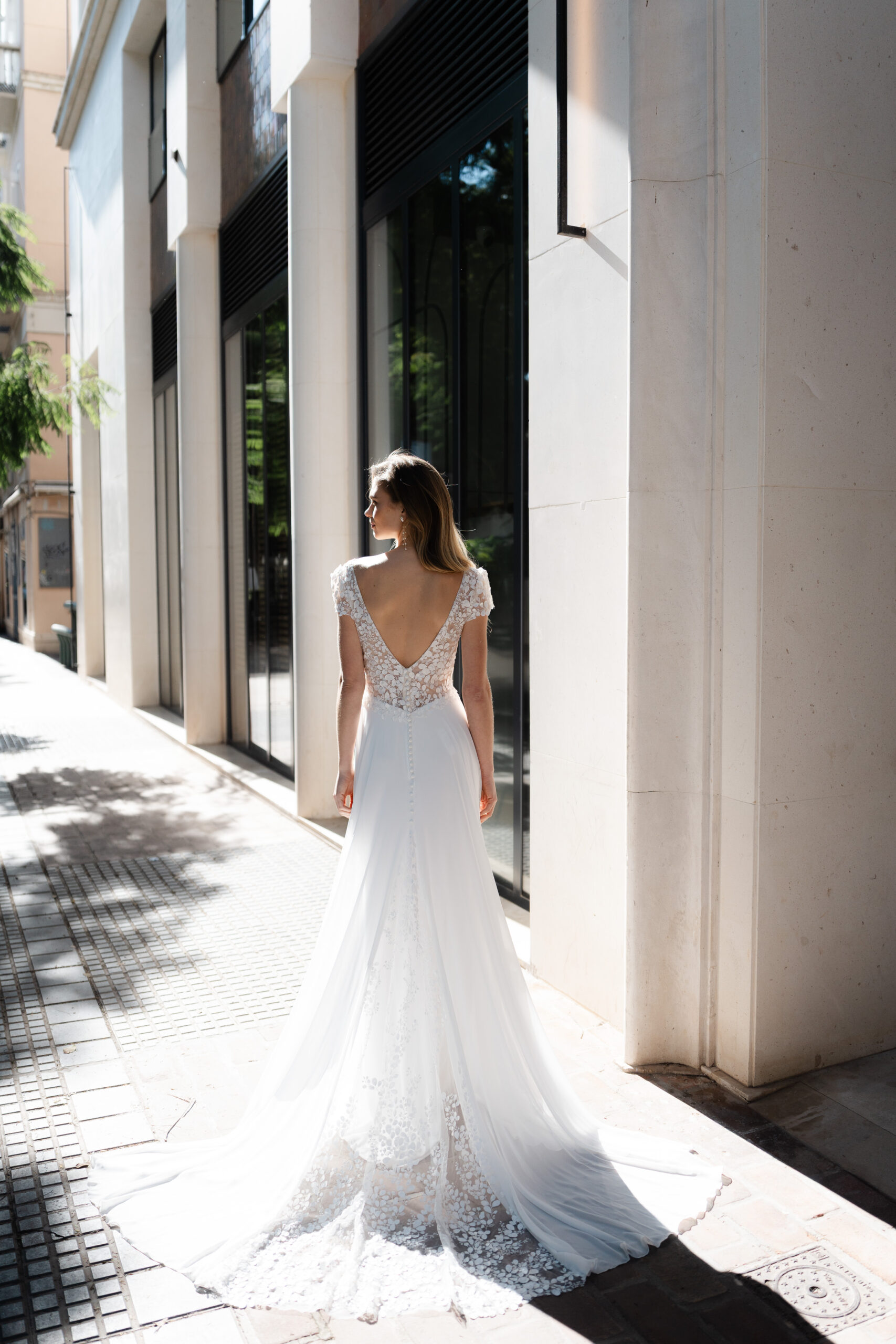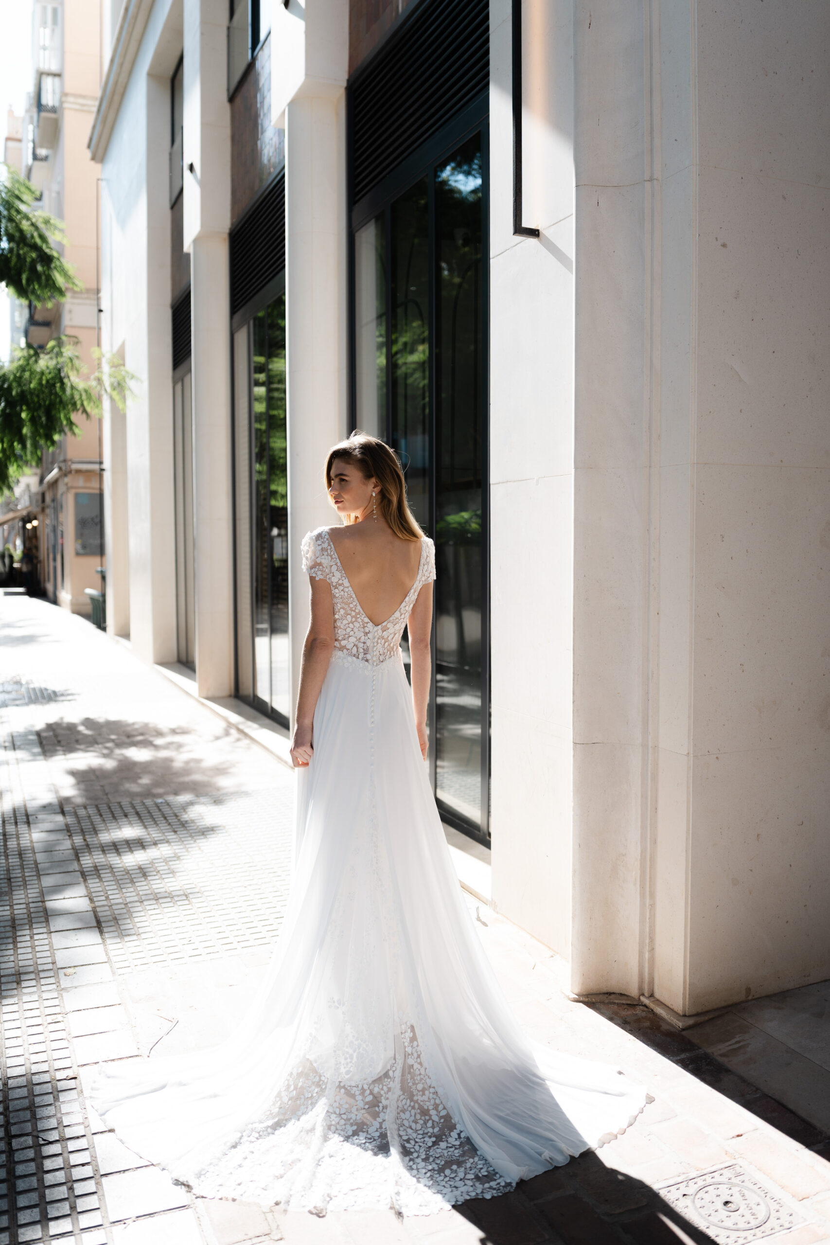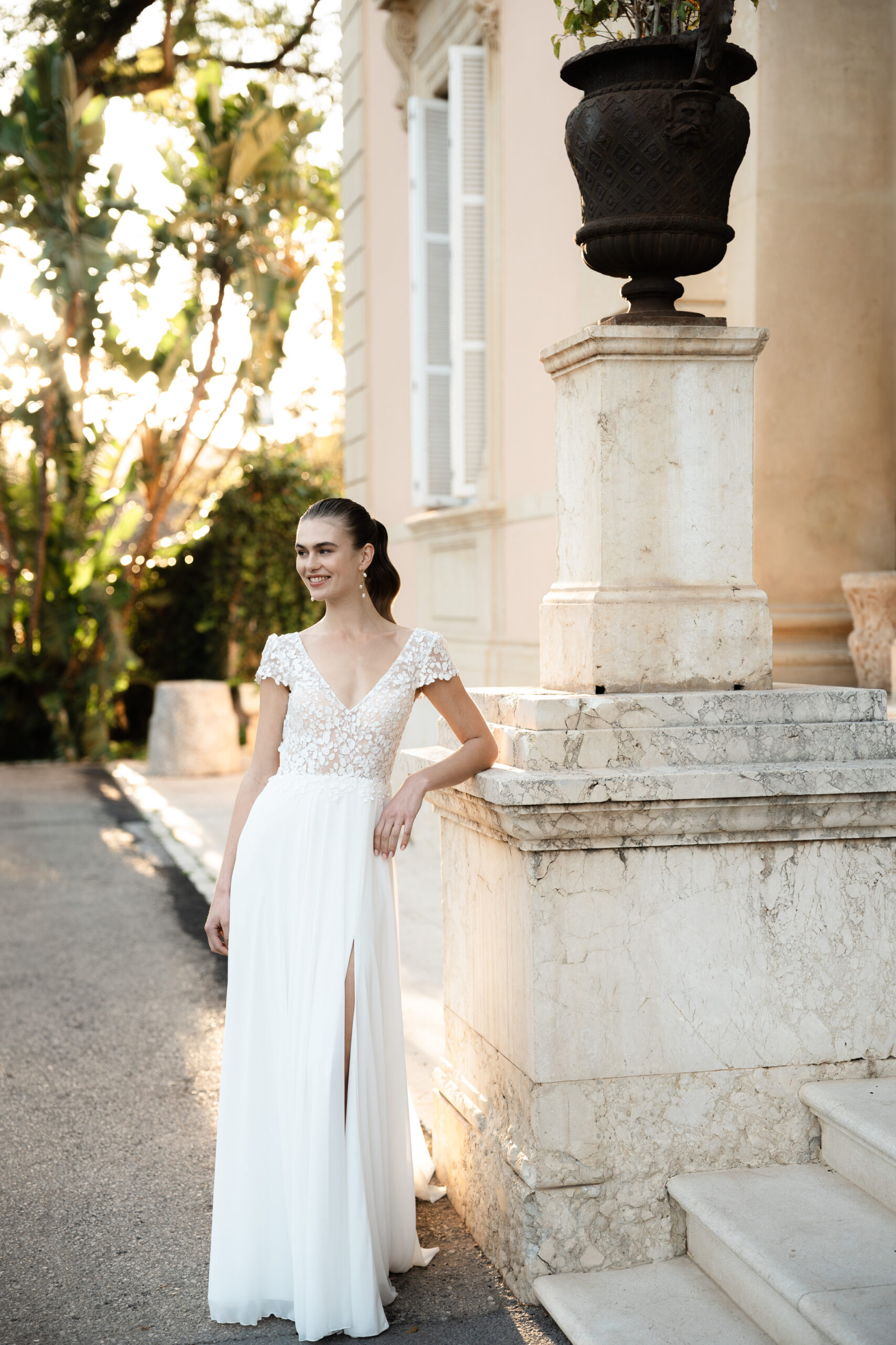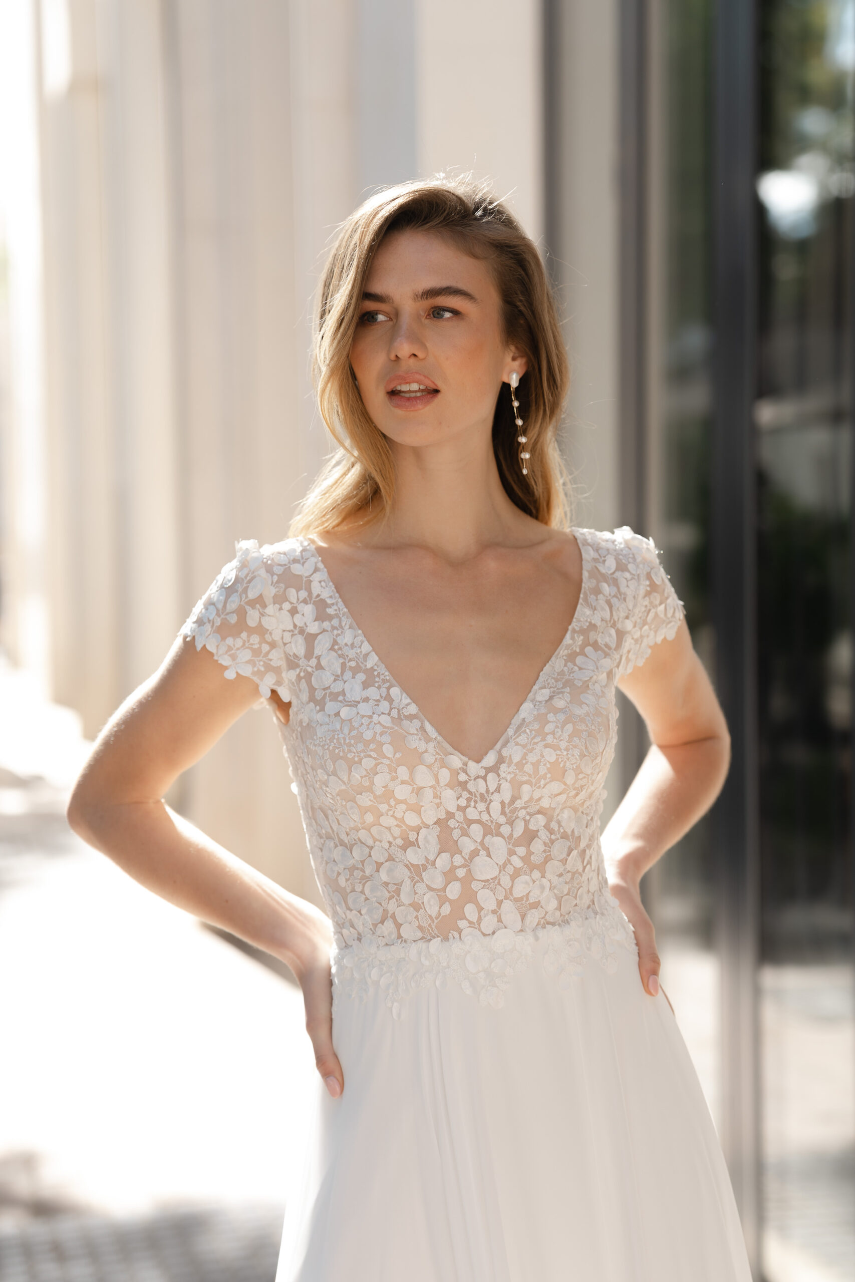 Kiss From a Rose de Marylise est une robe de mariée au charme bohème et romantique. Son décolleté en V et ses manches courtes délicates encadrent le haut en transparence orné de dentelle raffinée, créant un subtil jeu de lumière et de féminité. Le dos en V prolonge cette élégance avec douceur, tandis que la coupe fluide invite à des pas légers et gracieux. Une robe parfaite pour les mariées qui rêvent d’un mariage poétique et naturel.