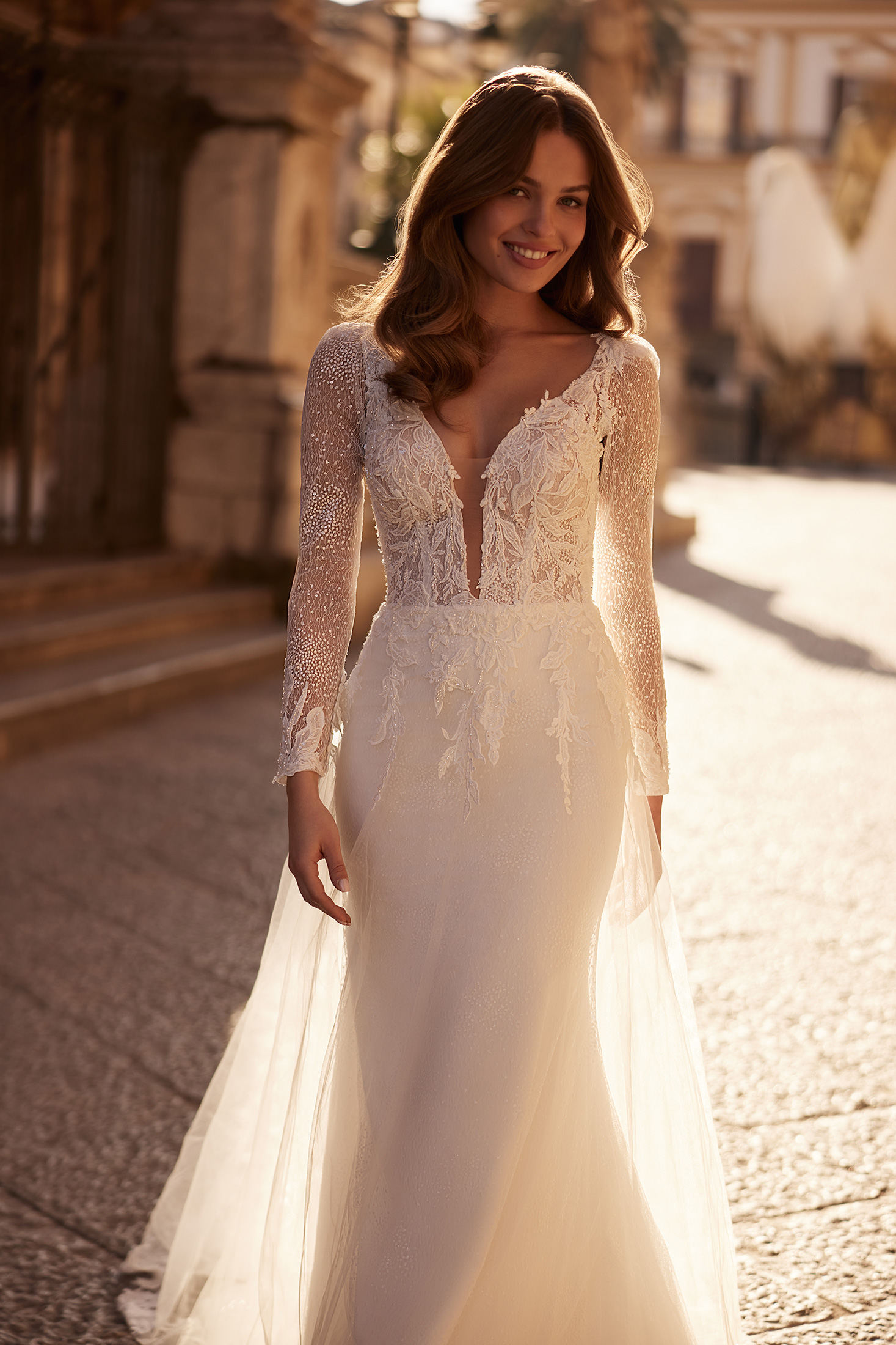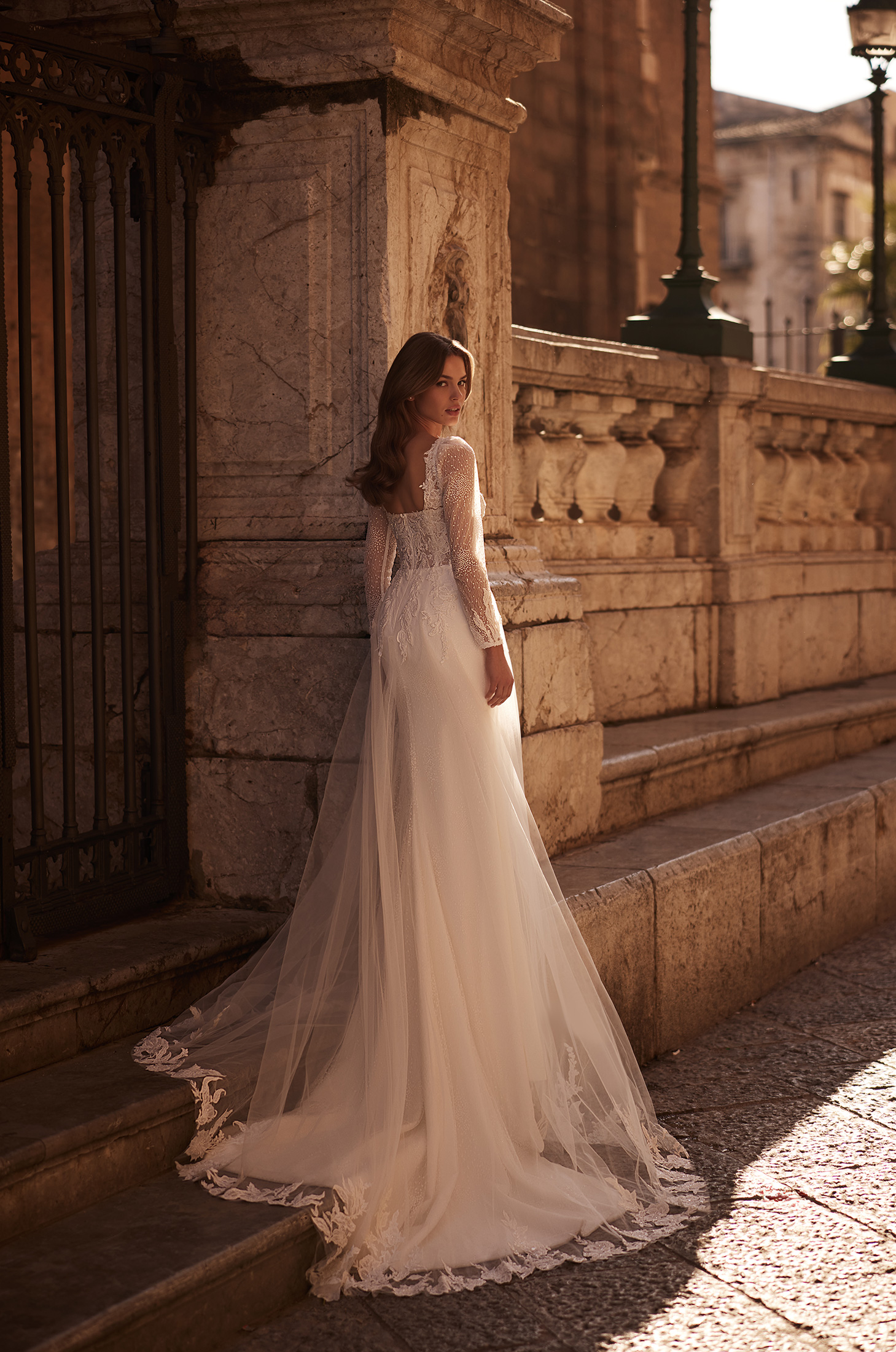 La robe Lada est le choix idéal pour la mariée en quête d’une élégance naturelle, mêlée à une légère touche de féérie.