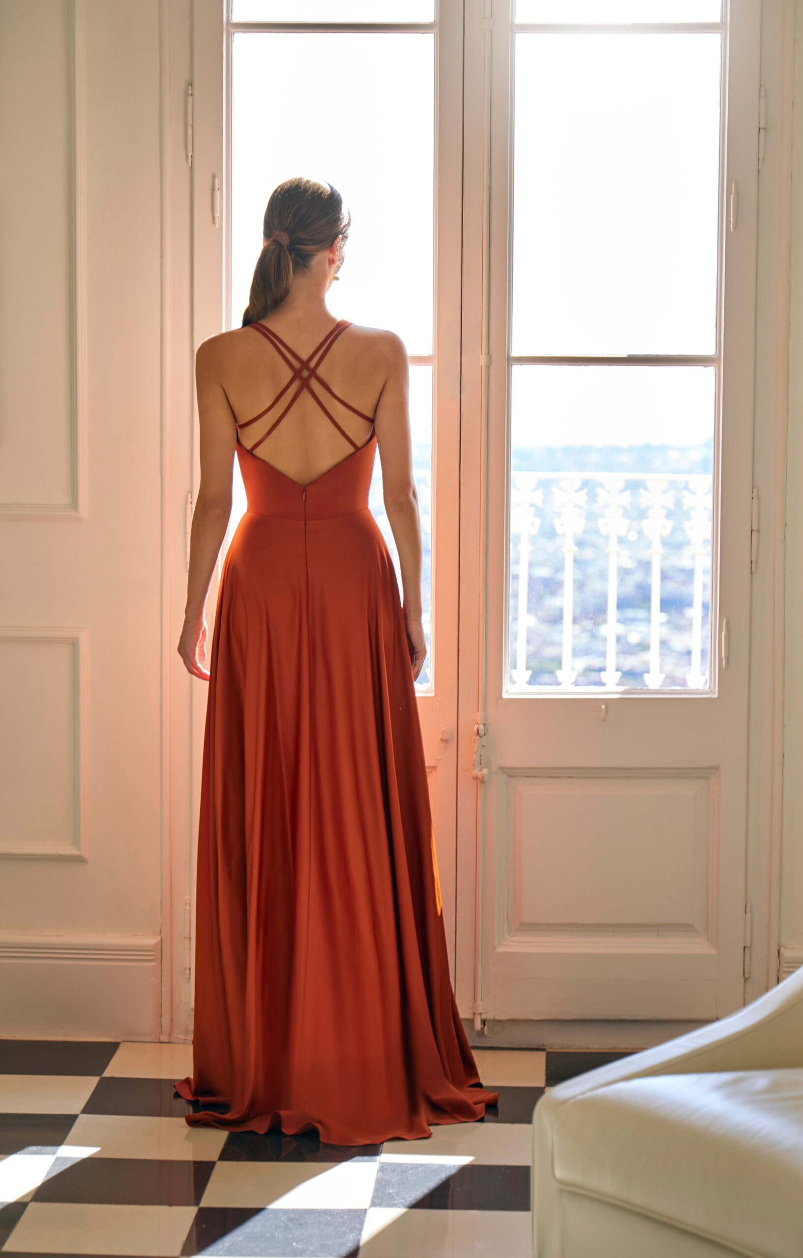 Cette robe longue séduit par son élégance intemporelle et sa teinte terracotta chaleureuse qui illumine le teint. Son décolleté délicatement drapé apporte une touche de féminité et de douceur, tandis que les fines bretelles soulignent avec finesse les épaules et le port de tête.