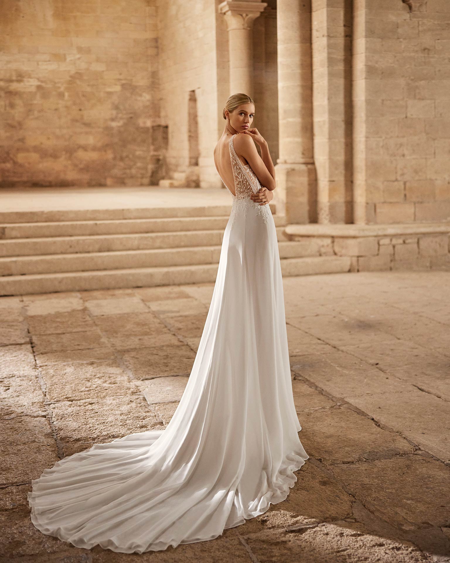 Robe de mariée en georgette Rosa Clará avec corsage en dentelle, bretelles délicates et dos plongeant orné de perles.