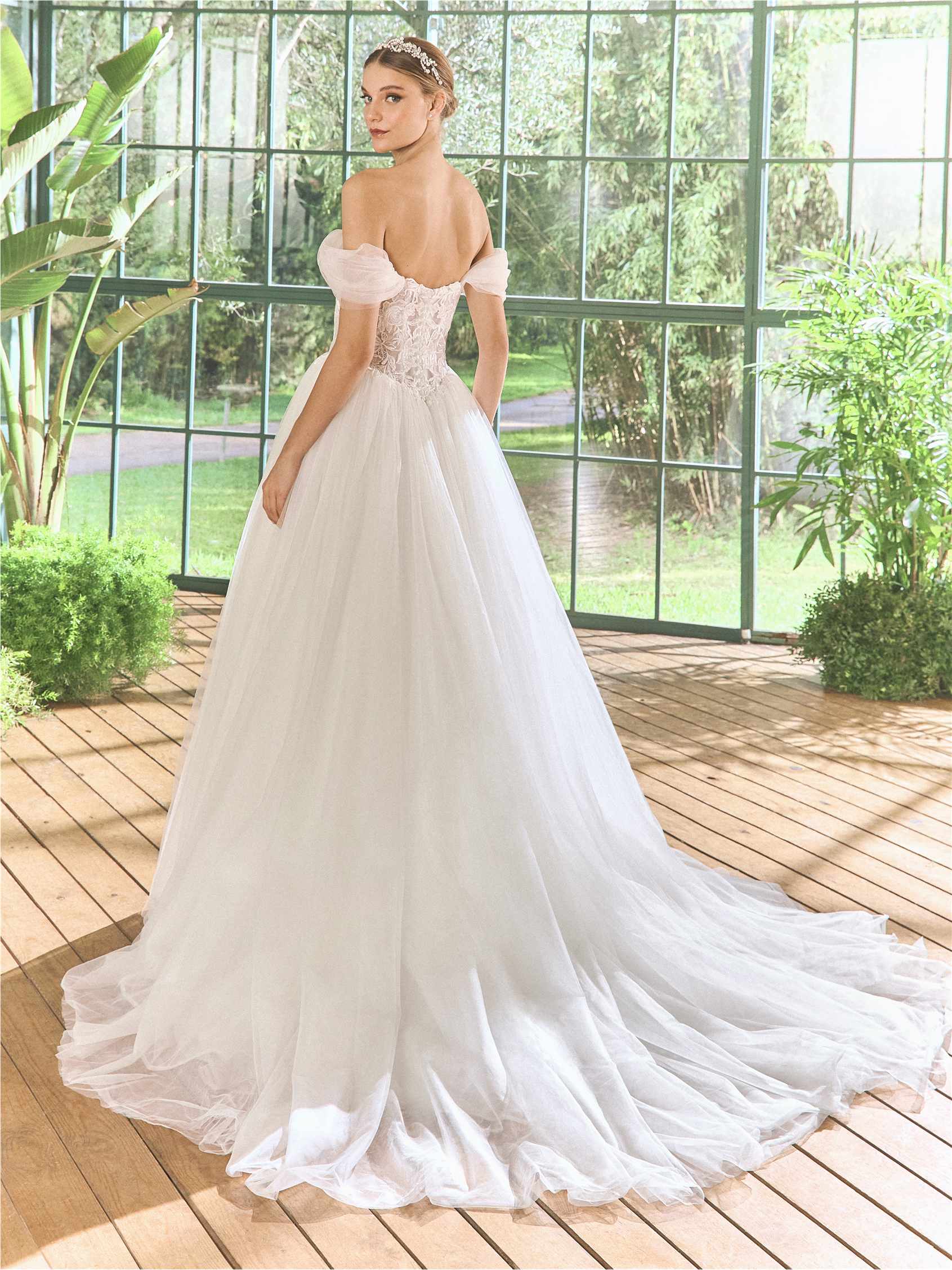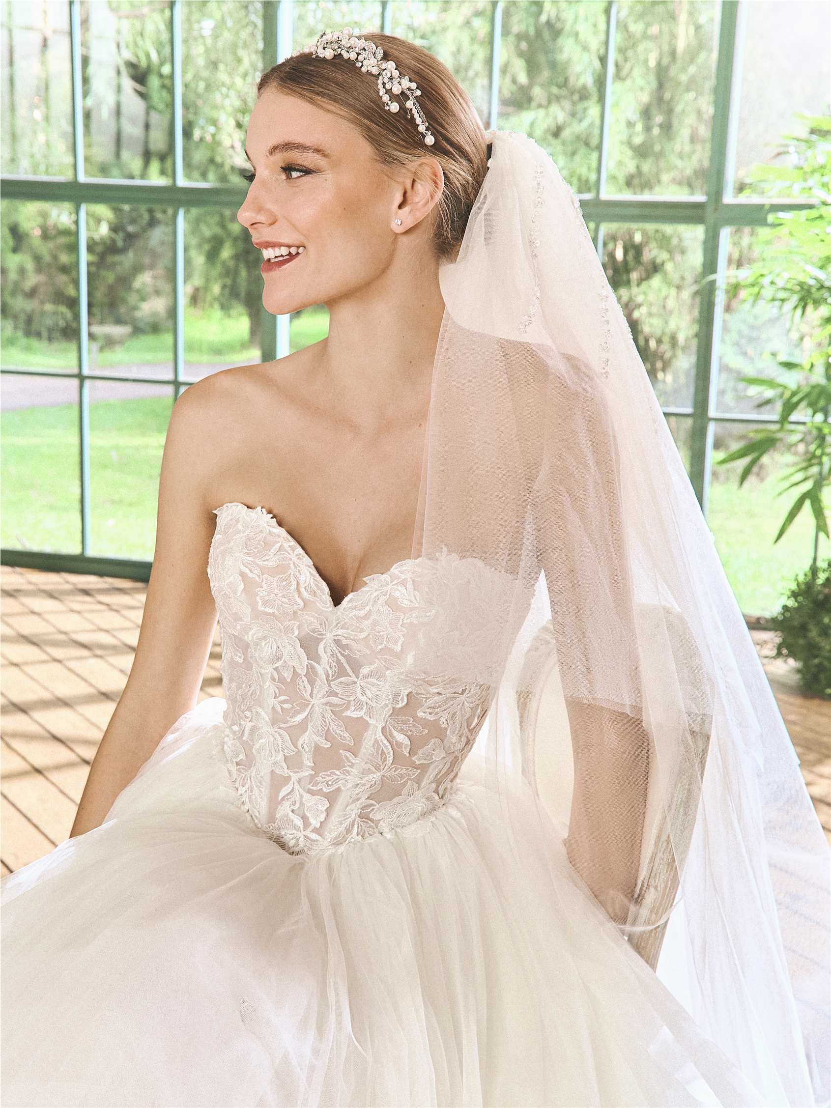 Robe princesse en tulle avec décolleté en cœur, dentelle et perles. Une allure lumineuse et grandiose.