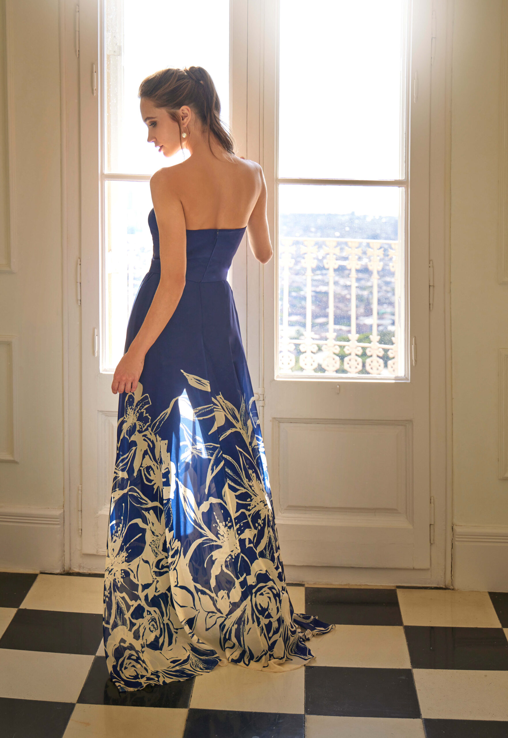Chic et moderne, cet ensemble de cérémonie se compose d’un bustier structuré qui sublime les épaules et d’un pantalon/jupe fluide orné(e) d’un imprimé floral contrasté.