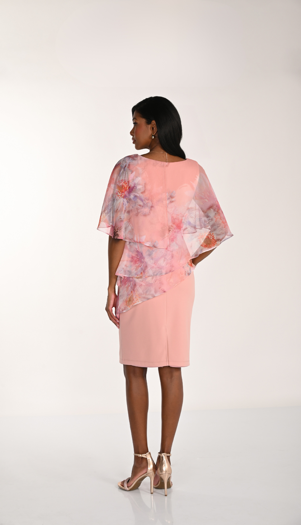 Robe cocktail rose poudré avec haut en voile floral superposé, manches fluides et jupe droite mi-longue.