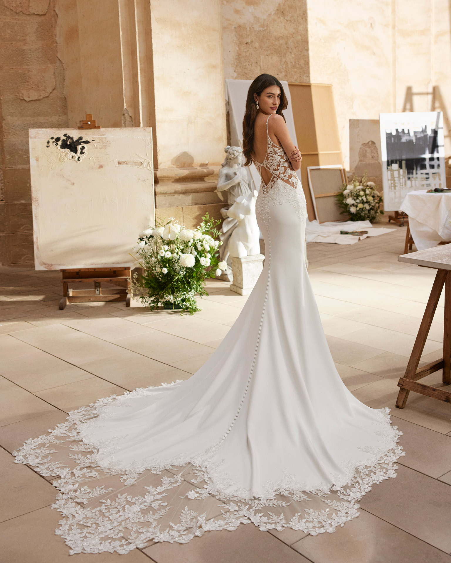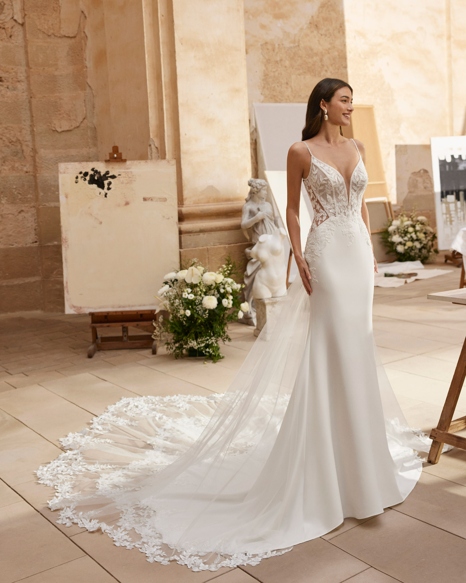 Robe de mariée longue, coupe sirène. En crêpe avec empiècements en dentelle illusion, décolleté plongeant et dos transparent, traîne en tulle brodé.