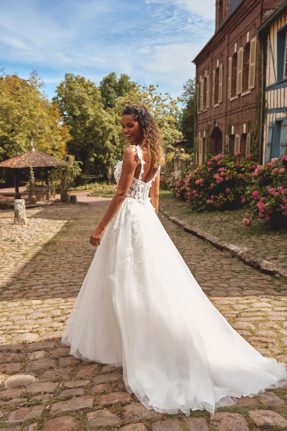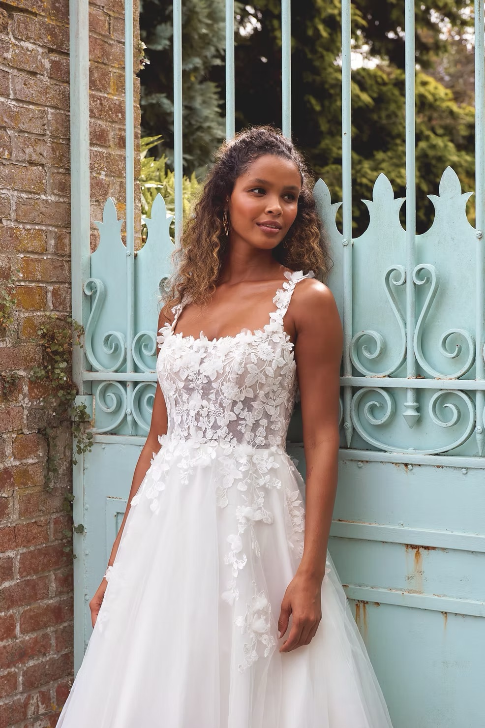 Une robe de mariée romantique signée Justin Alexander, alliant dentelle florale et tulle aérien pour une allure élégante, naturelle et pleine de grâce.