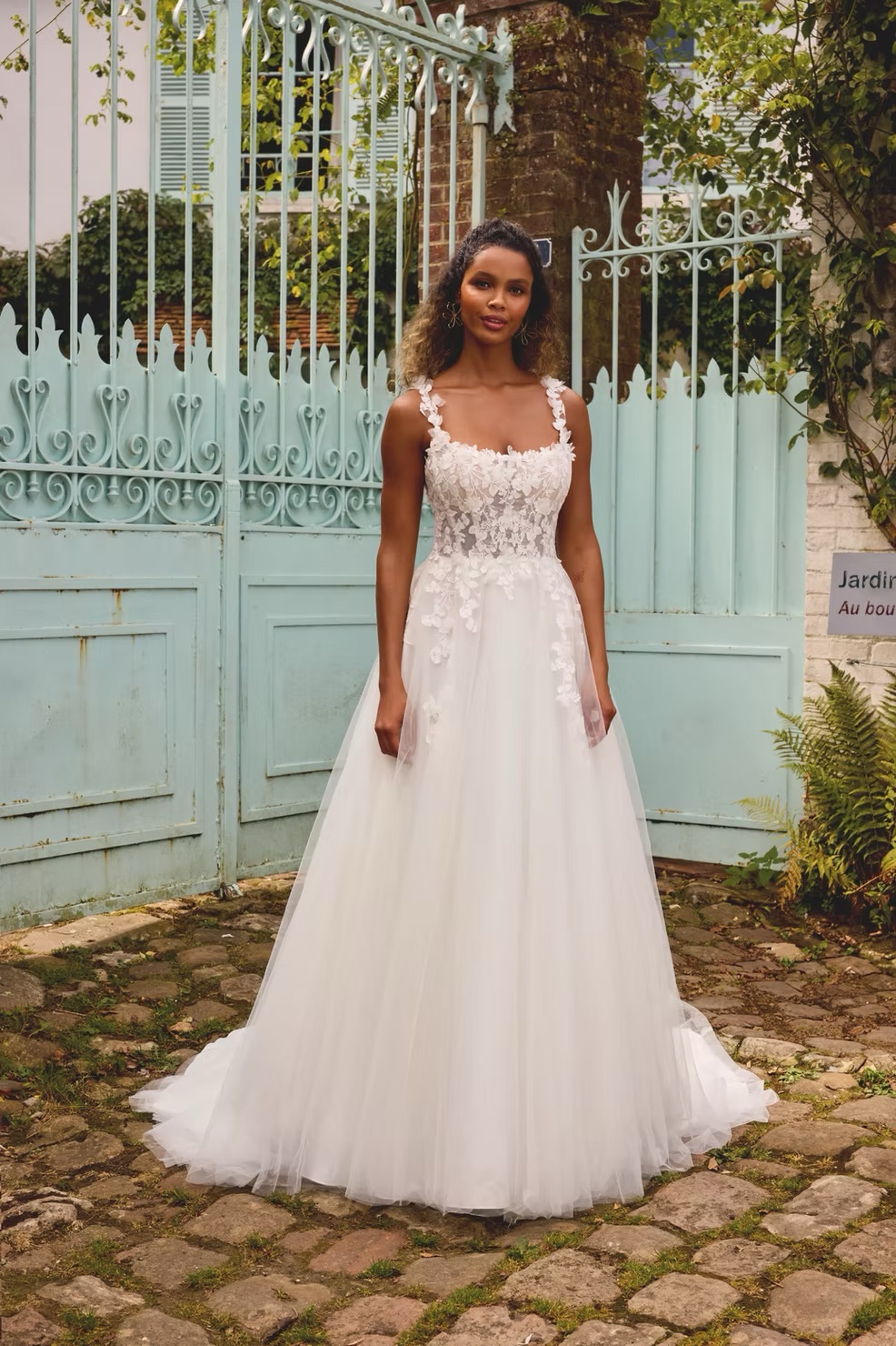Élégante et intemporelle, cette robe de mariée signée Justin Alexander séduit par son allure à la fois romantique et naturelle. Son corsage ajusté dévoile un somptueux jeu de dentelle florale en relief, délicatement posé sur un bustier au col carré qui sublime le décolleté et les épaules.La jupe vaporeuse en tulle s’évase avec légèreté, créant un mouvement aérien à chaque pas, pour une silhouette pleine de grâce.