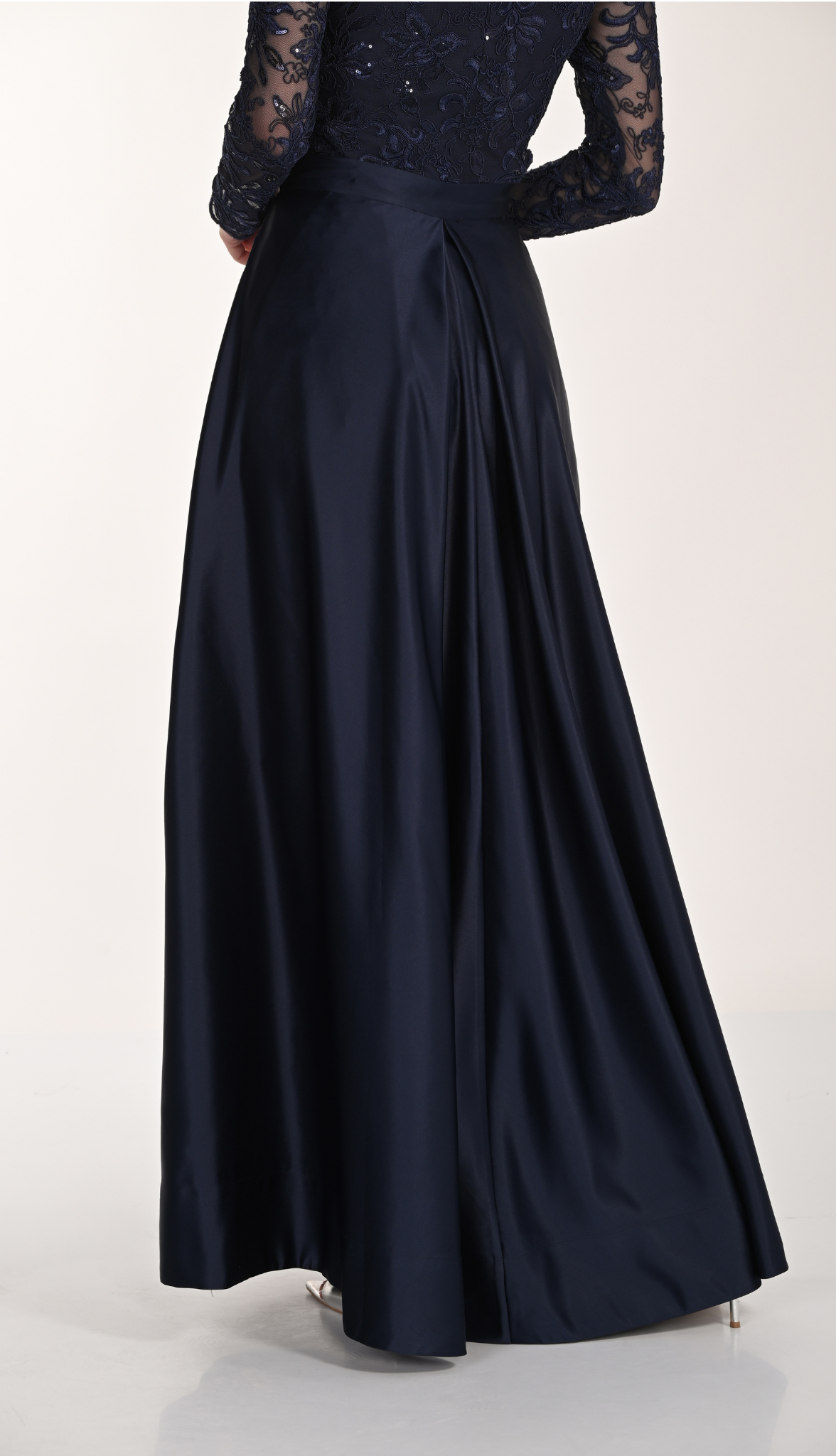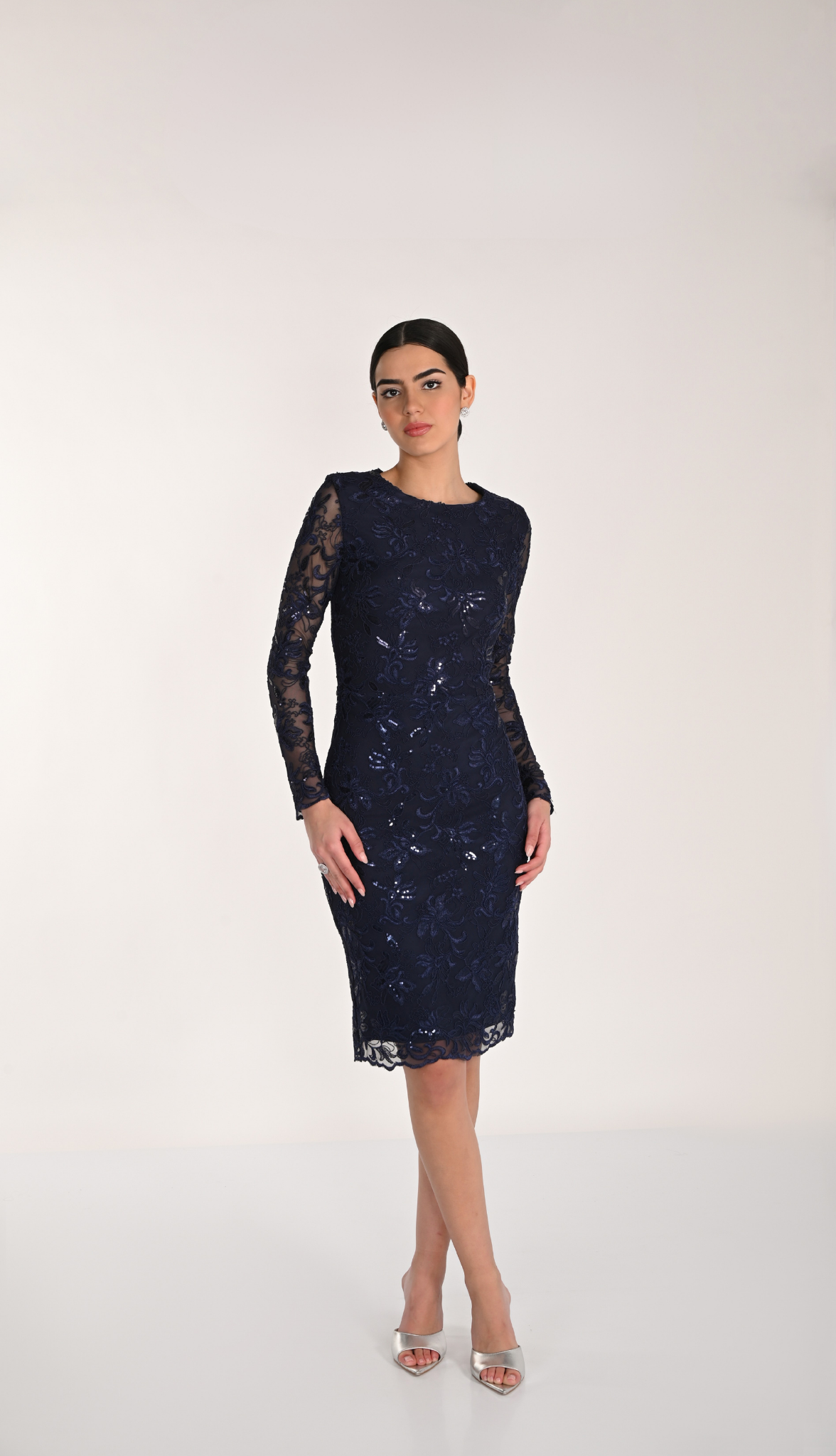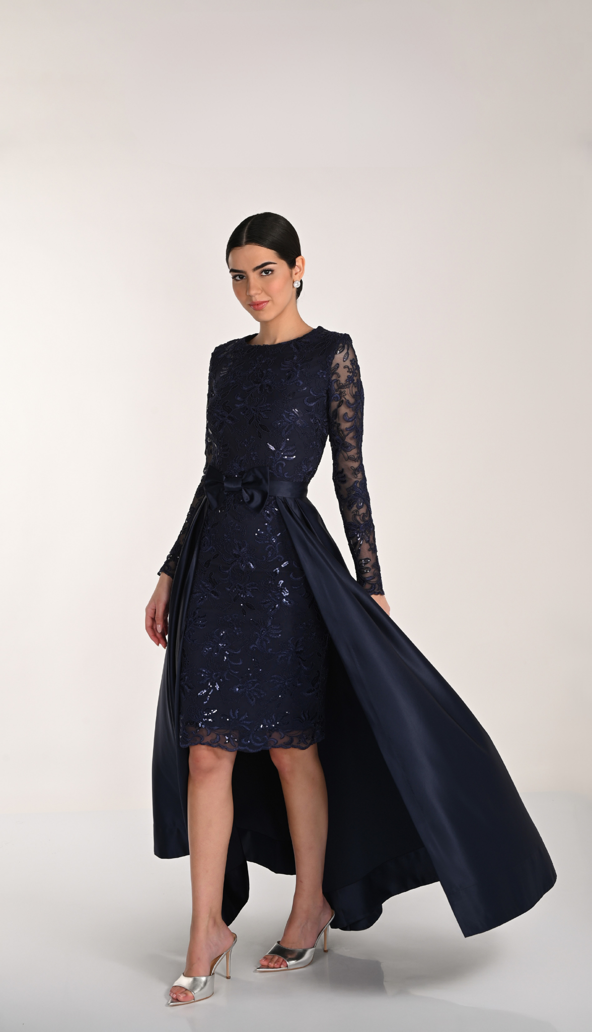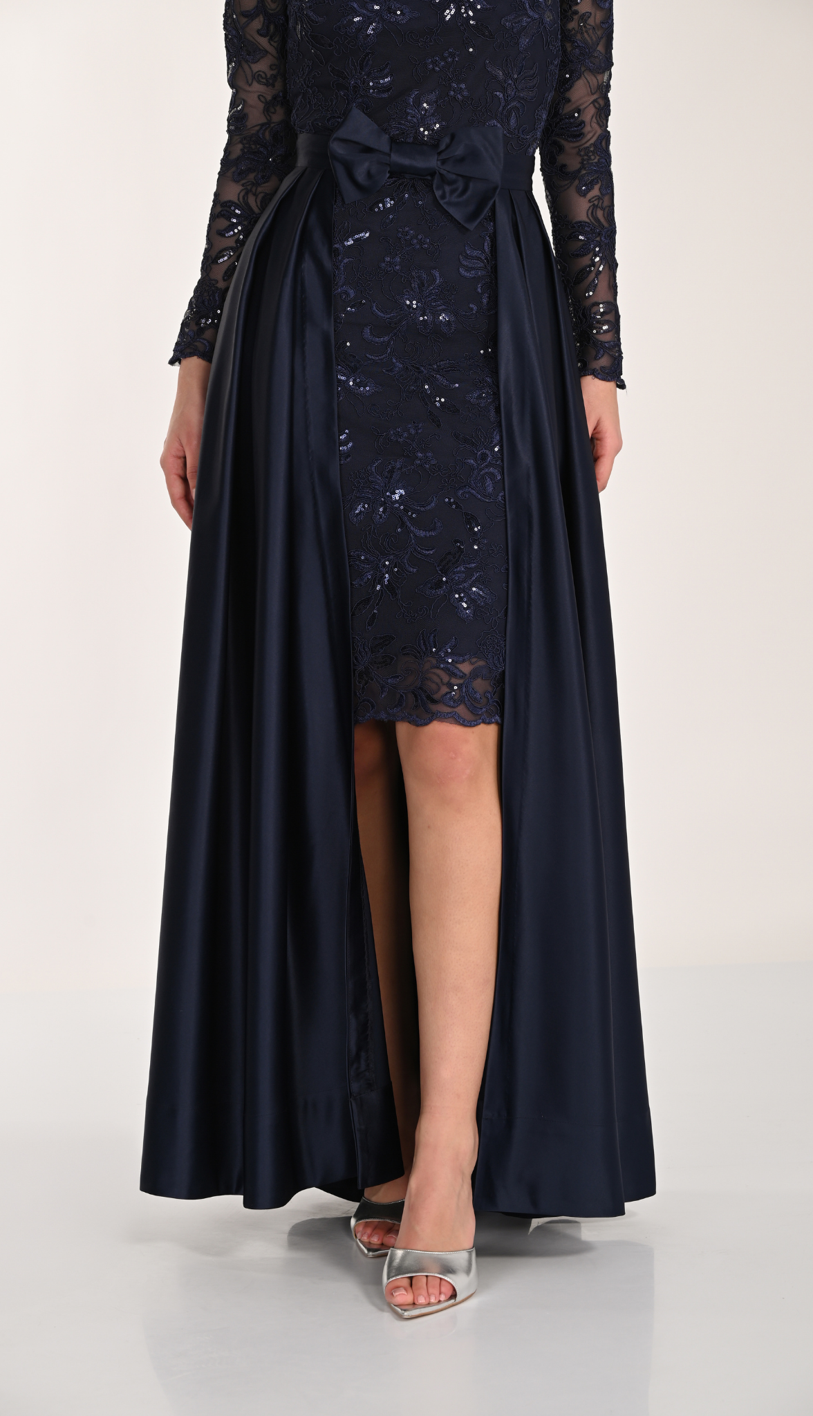 Robe cocktail bleu nuit en dentelle avec manches longues et sequins ton sur ton. Disponible avec jupe longue satinée amovible pour un effet transformable.