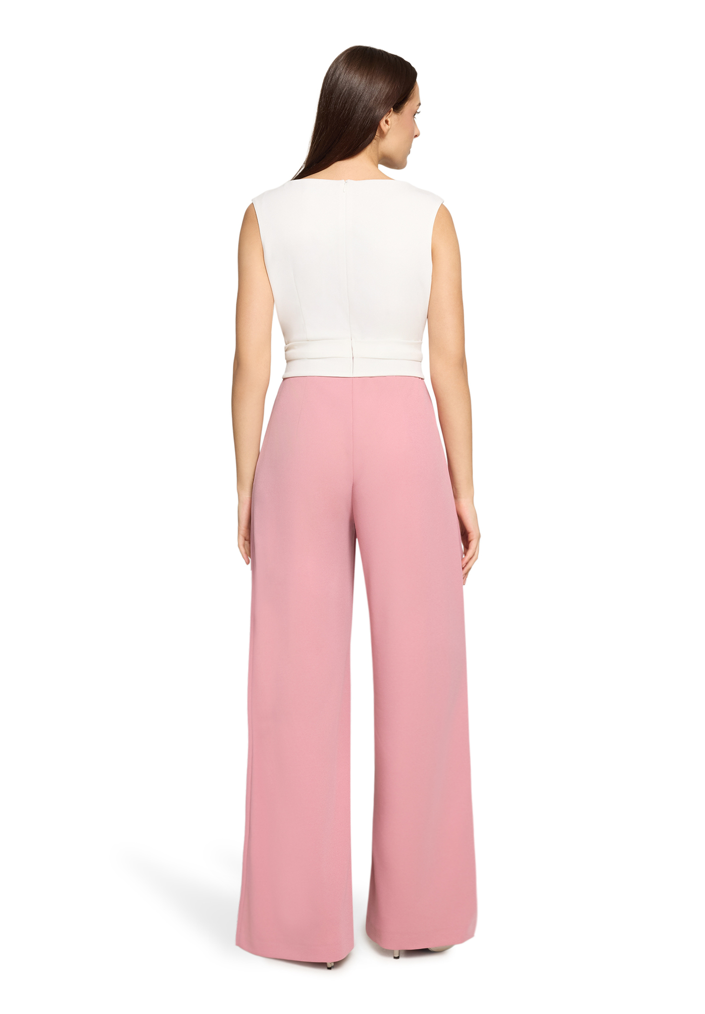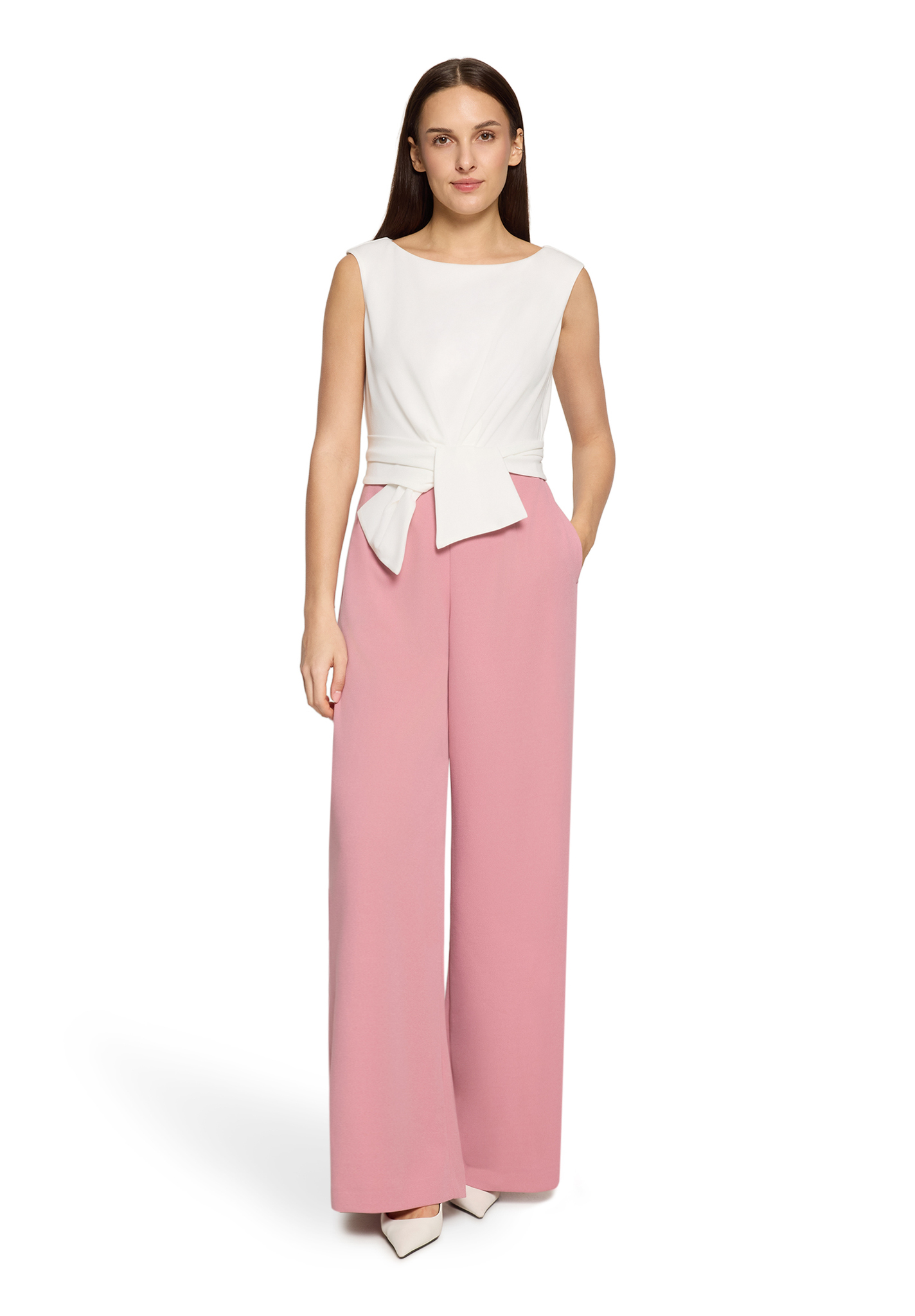 Combinaison fluide rose et crème nouée à la taille