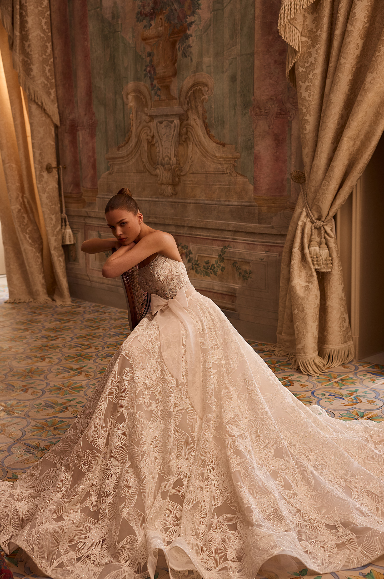 Cette somptueuse robe de mariée bustier évasée en A est confectionnée dans une dentelle raffinée aux motifs minutieusement travaillés, offrant profondeur et sophistication à l’ensemble.