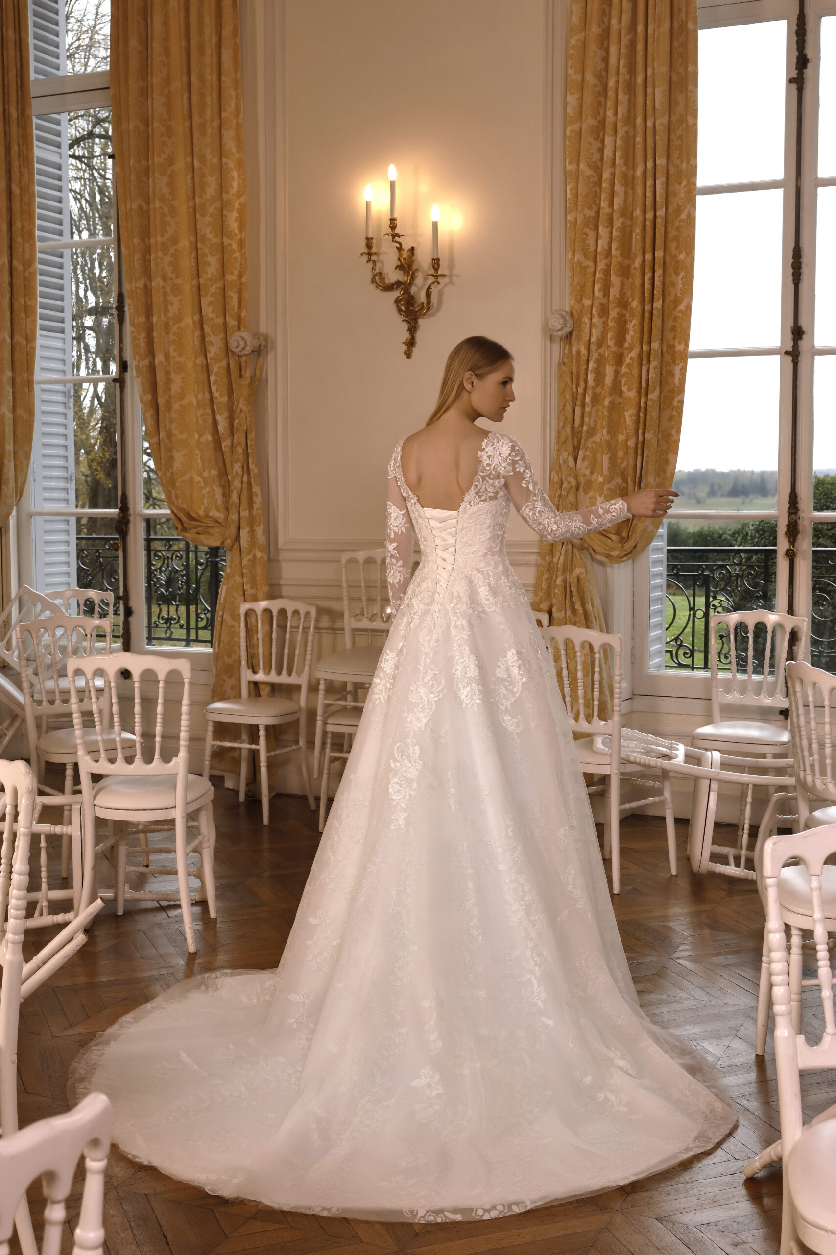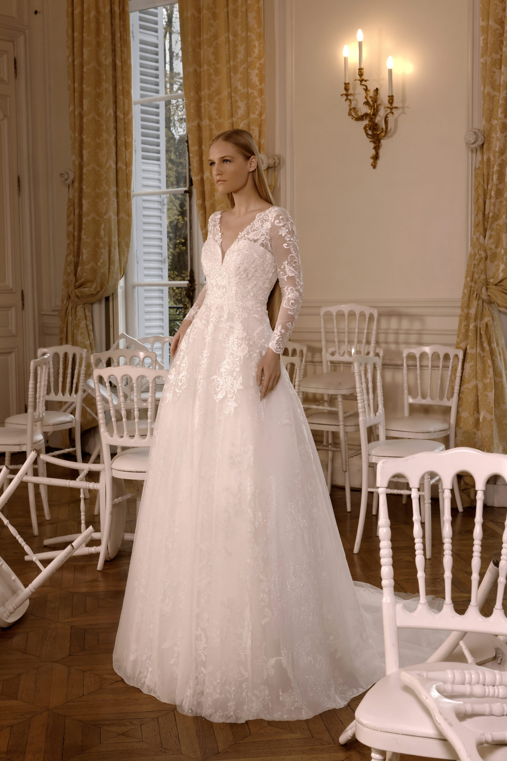 Cette robe de mariée conjugue délicatesse et élégance avec sa jupe en tulle finement brodé qui danse au moindre mouvement. La coupe trapèze offre une silhouette flatteuse et confortable, tandis que les manches longues apportent une touche sophistiquée et intemporelle. Le décolleté en V sublime le buste avec grâce, dévoilant juste ce qu’il faut de féminité. Un modèle romantique et raffiné, parfait pour une mariée à la fois classique et moderne.