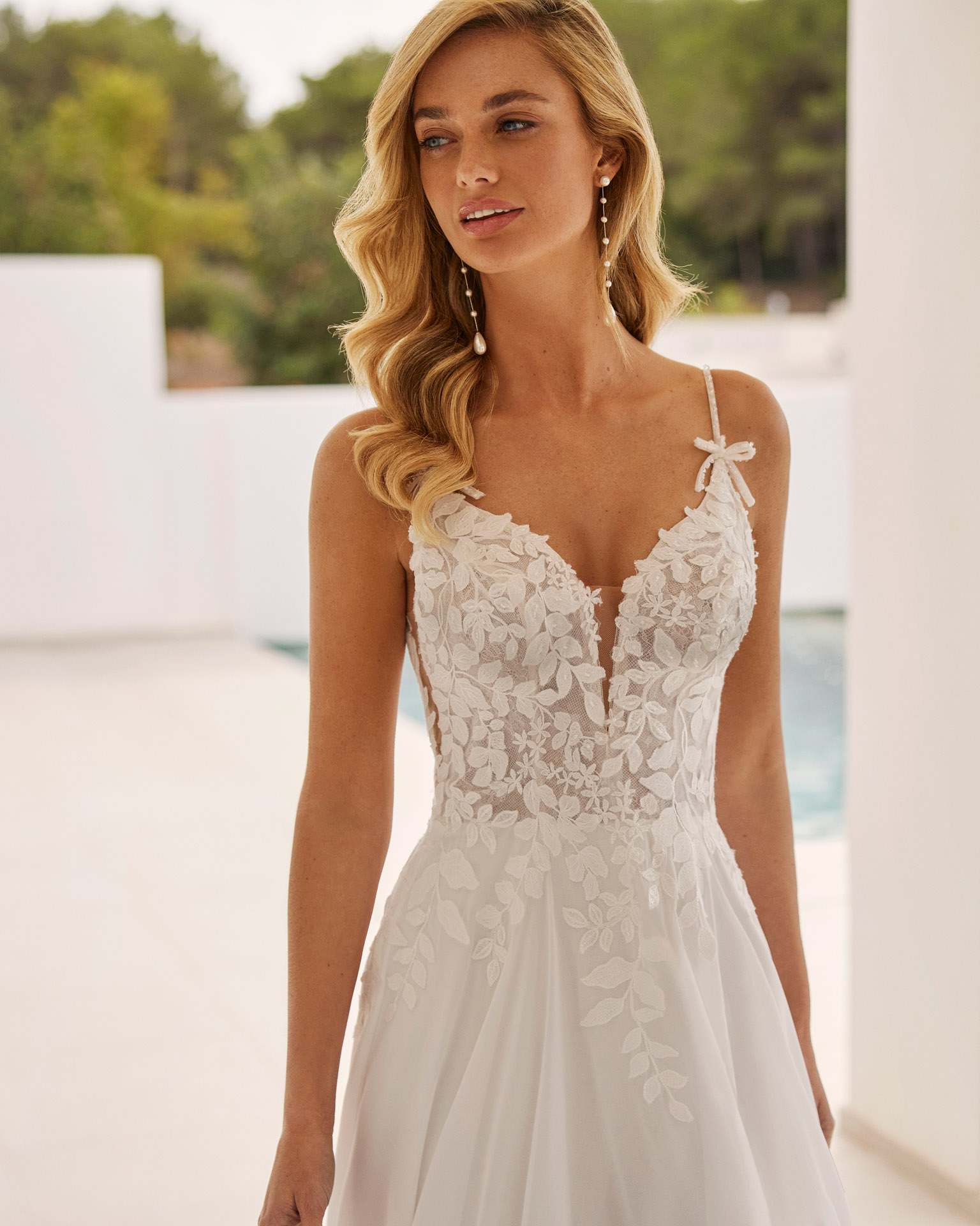 Robe romantique à manches longues en tulle brodé et décolleté subtil en transparence.