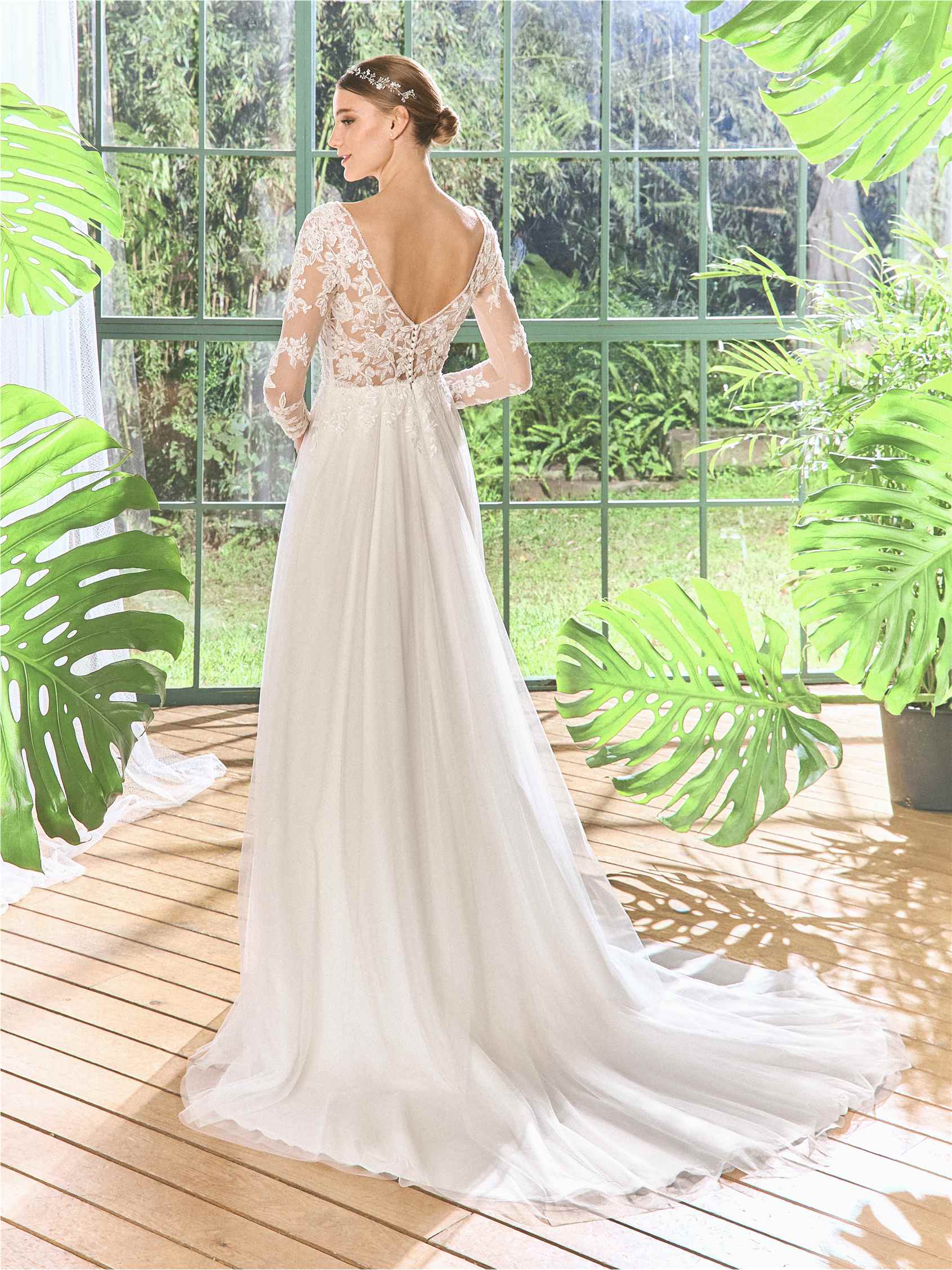 Robe ligne A en tulle et dentelle, manches longues, dos en V et détails perlés. Une allure romantique et raffinée.