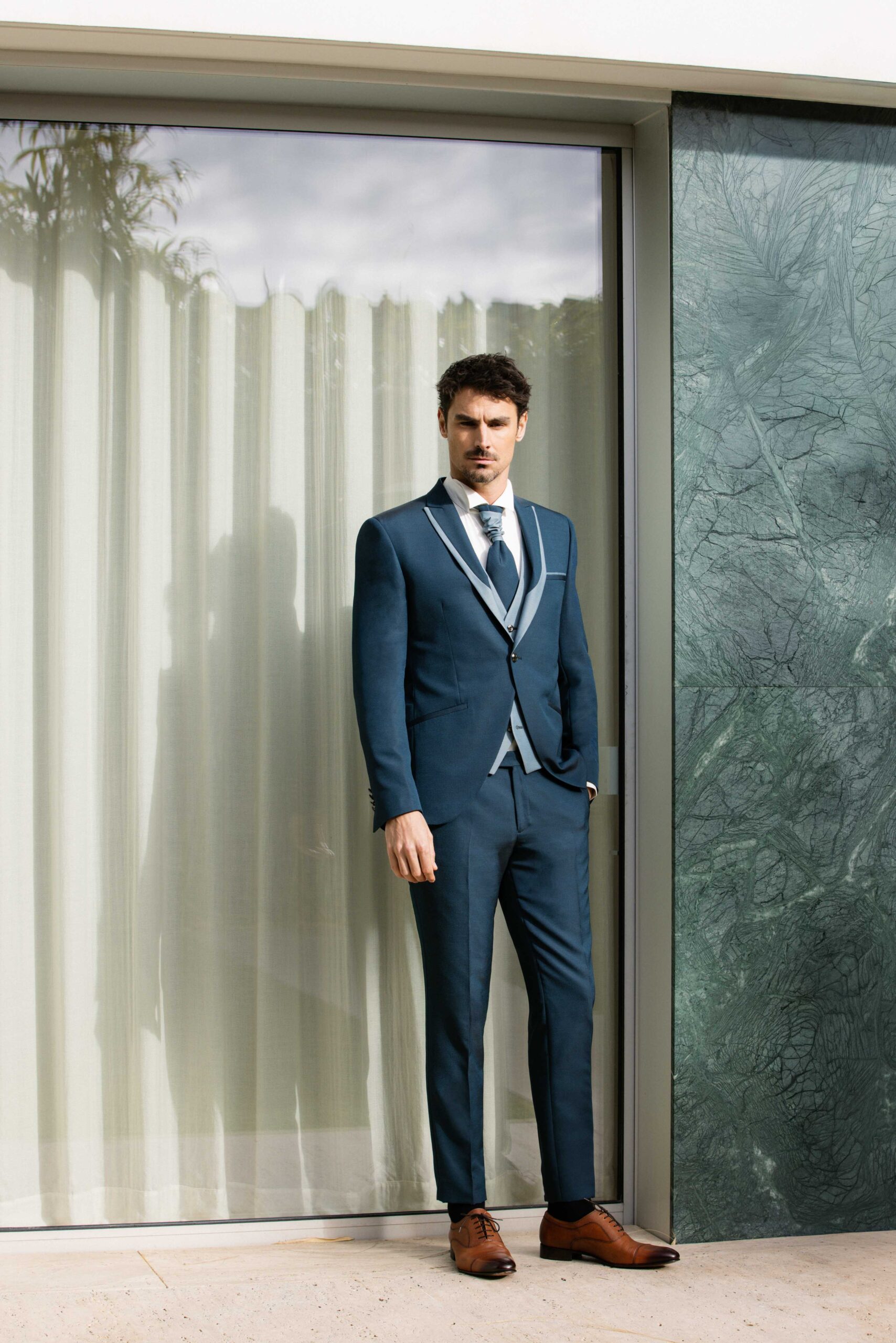 Le costume Savoie est un costume de cérémonie 3 pièces au style élégant et raffiné. Sa veste à col pointe, conçue à partir de deux tissus assortis, apporte relief et distinction à l’ensemble.