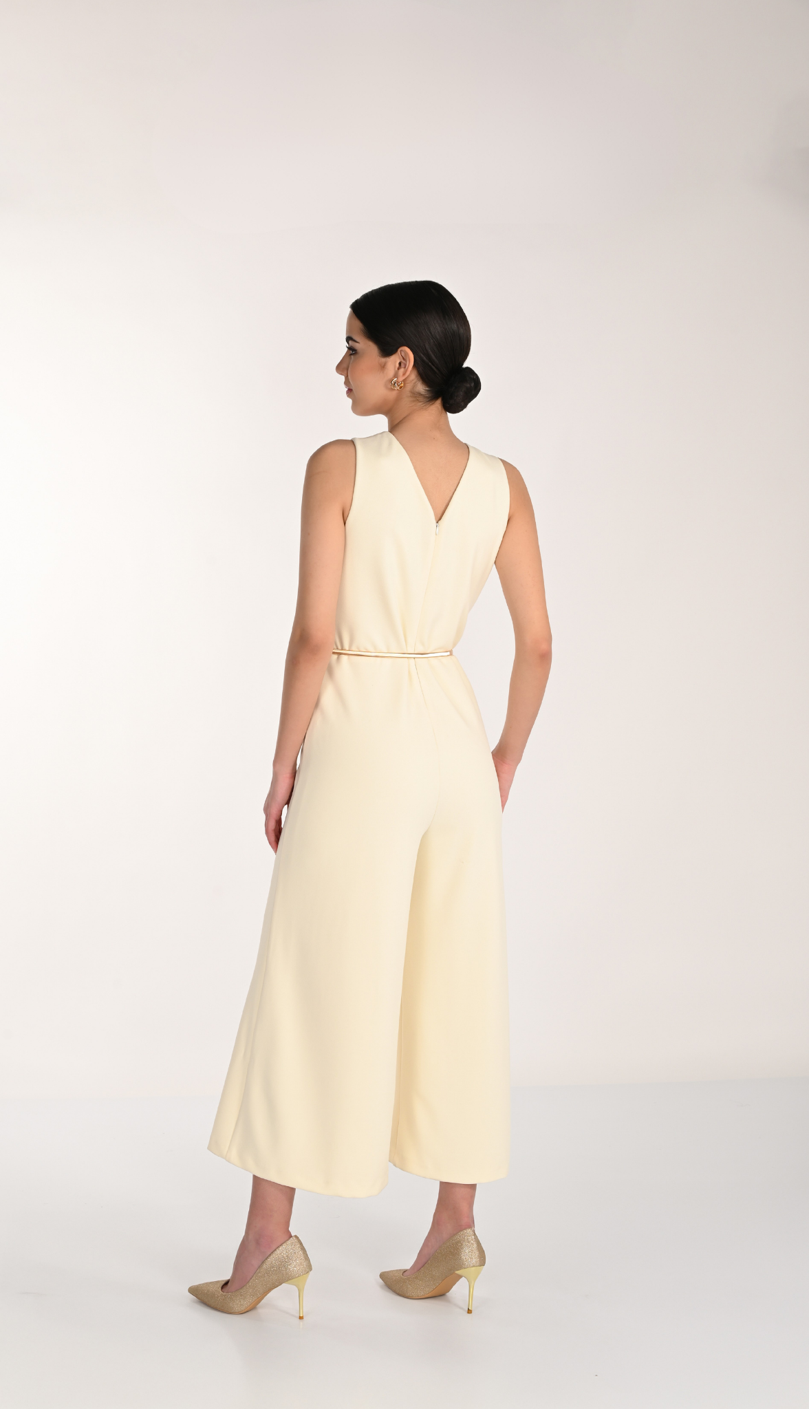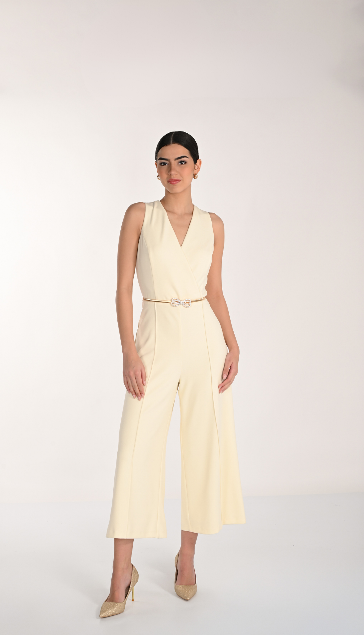 Combinaison jaune pâle avec décolleté en V croisé, coupe large fluide et ceinture fine ornée d’un détail bijou.