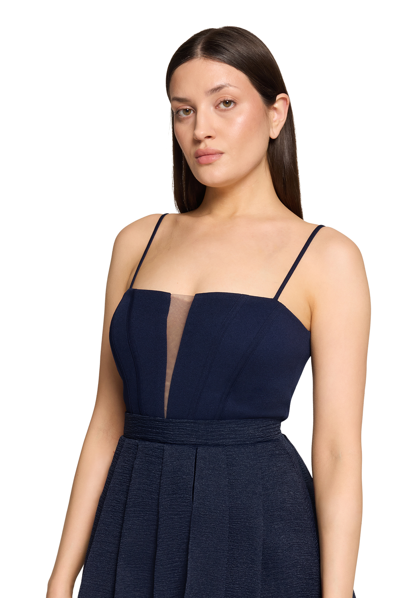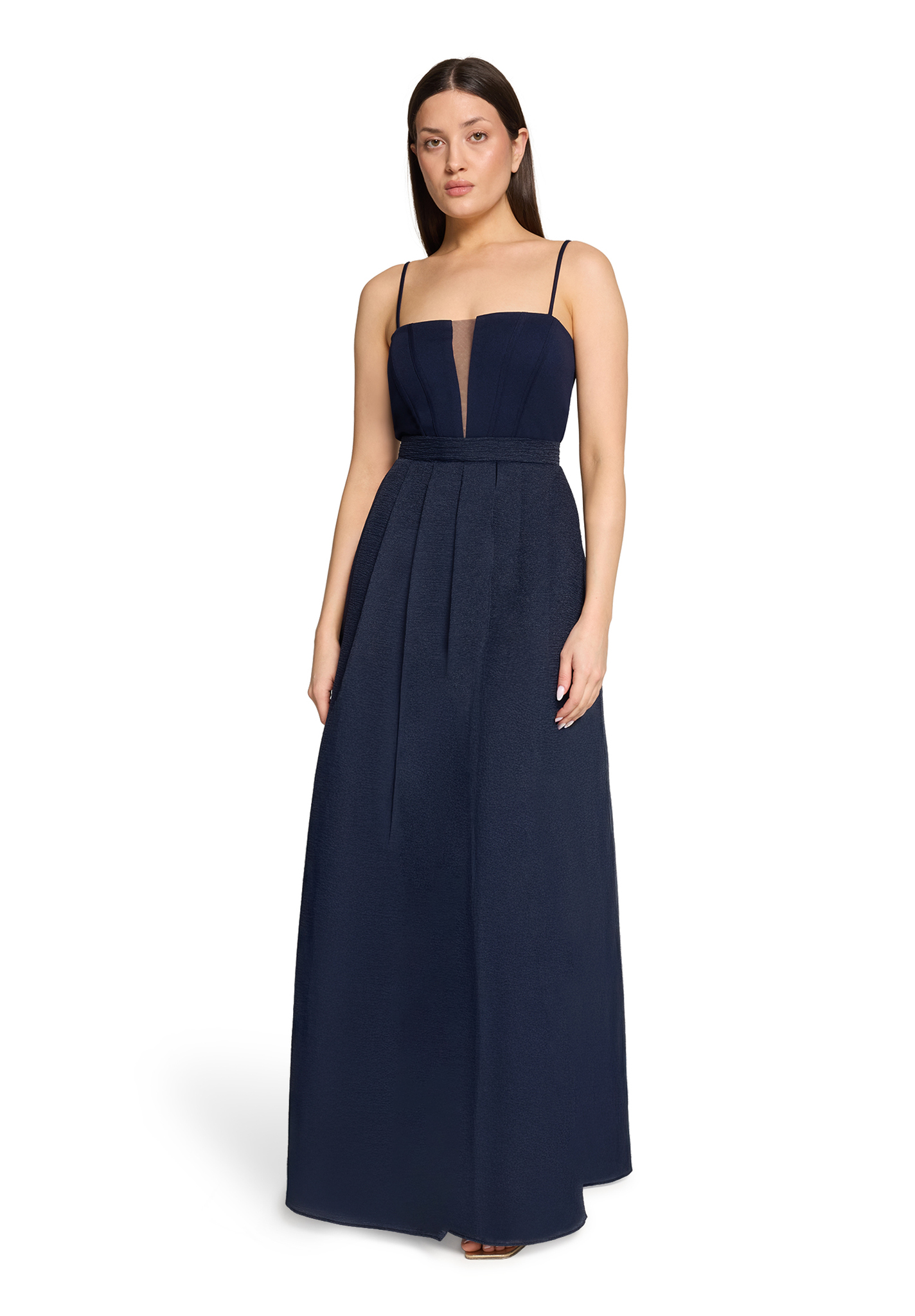 Cette robe longue bleu marine séduit par son allure moderne et raffinée. Son décolleté droit subtilement structuré est rehaussé d’un empiècement en tulle transparent qui apporte une touche délicate et contemporaine. Les fines bretelles soulignent élégamment les épaules.