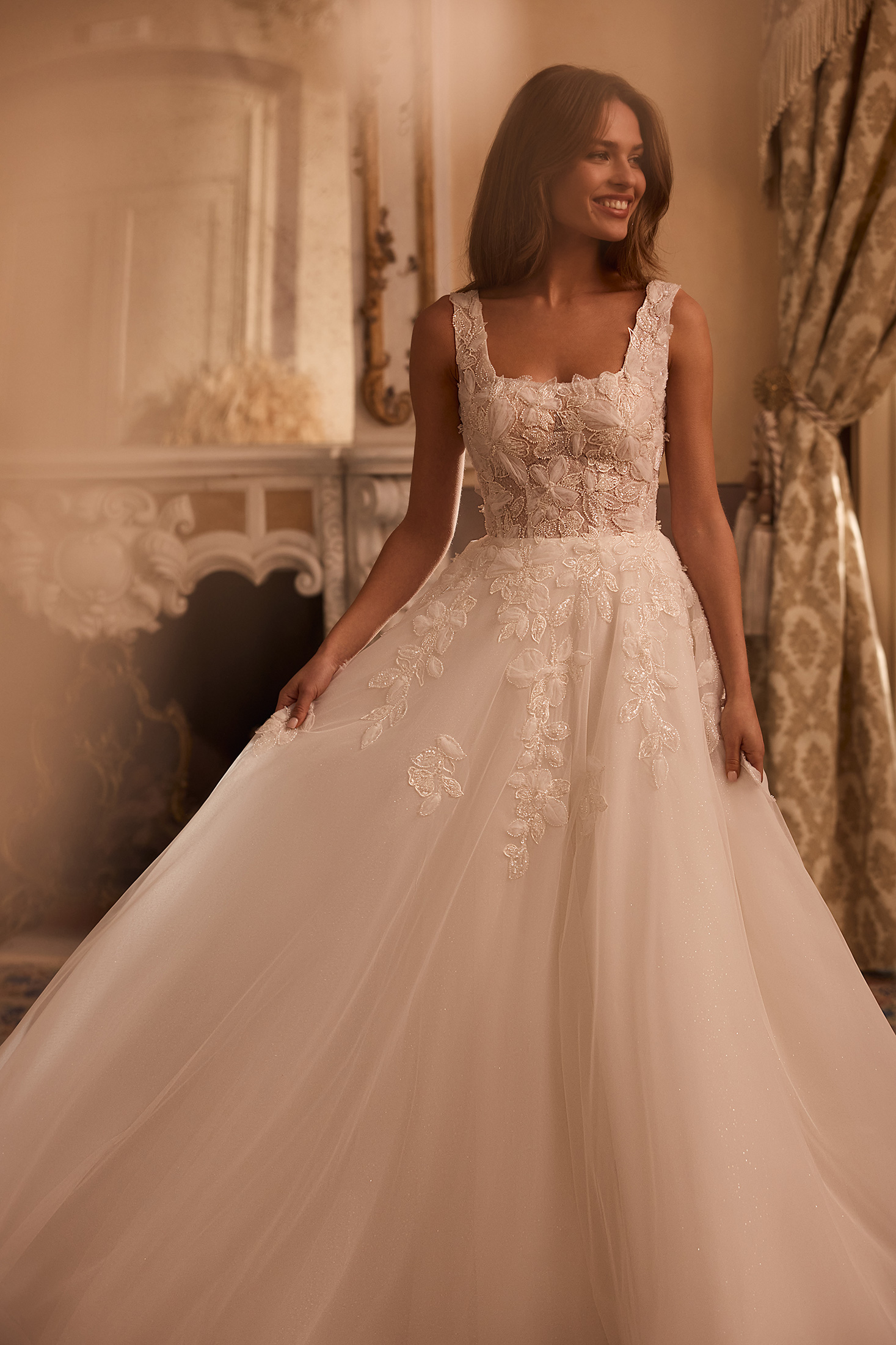 Son corsage en dentelle de Chantilly sert de base à de superbes appliques florales qui se prolongent délicatement le long de la jupe, créant une allure douce et poétique. Des couches de tulle pailleté diffusent un éclat subtil, rendant chaque mouvement magique et lumineux.