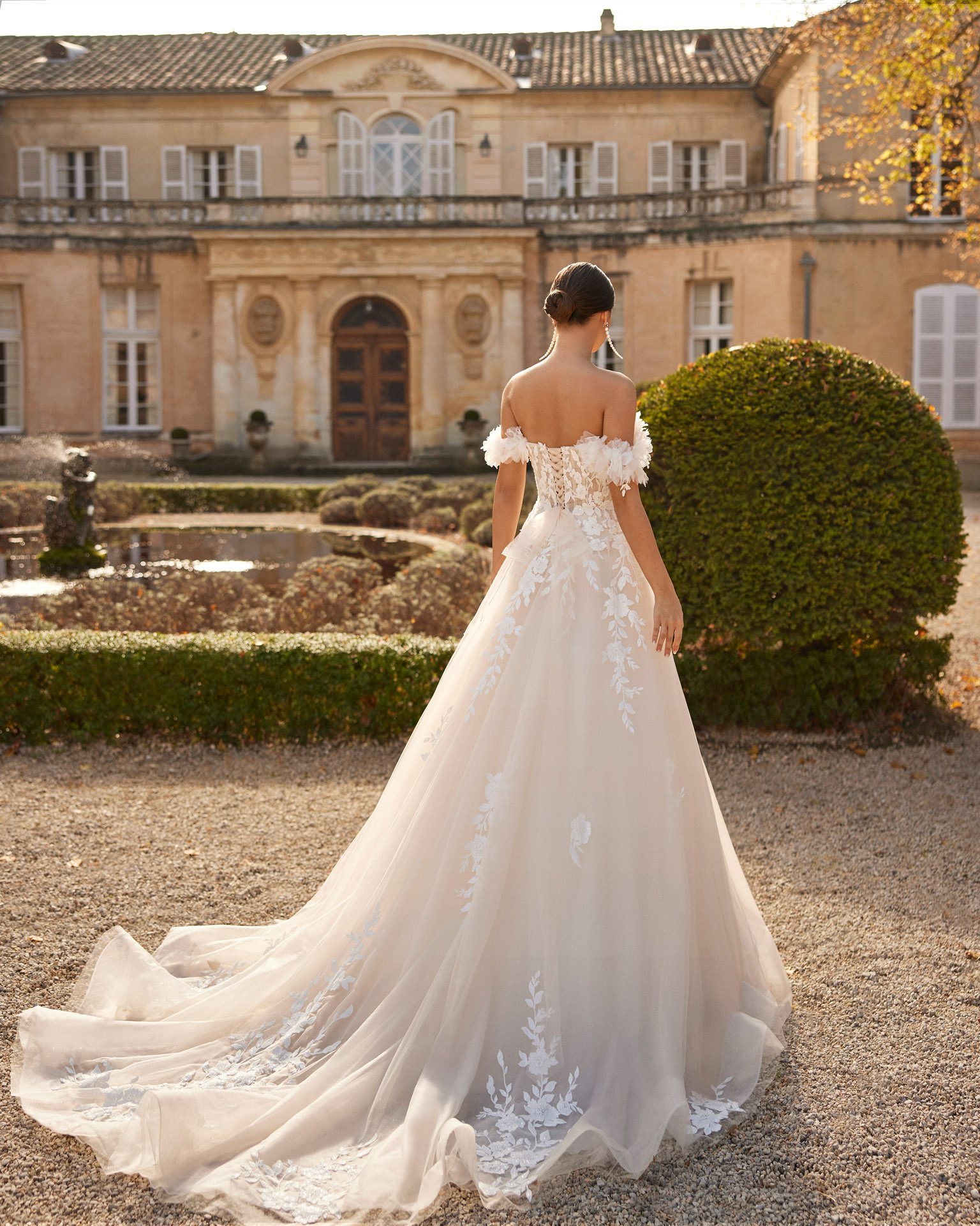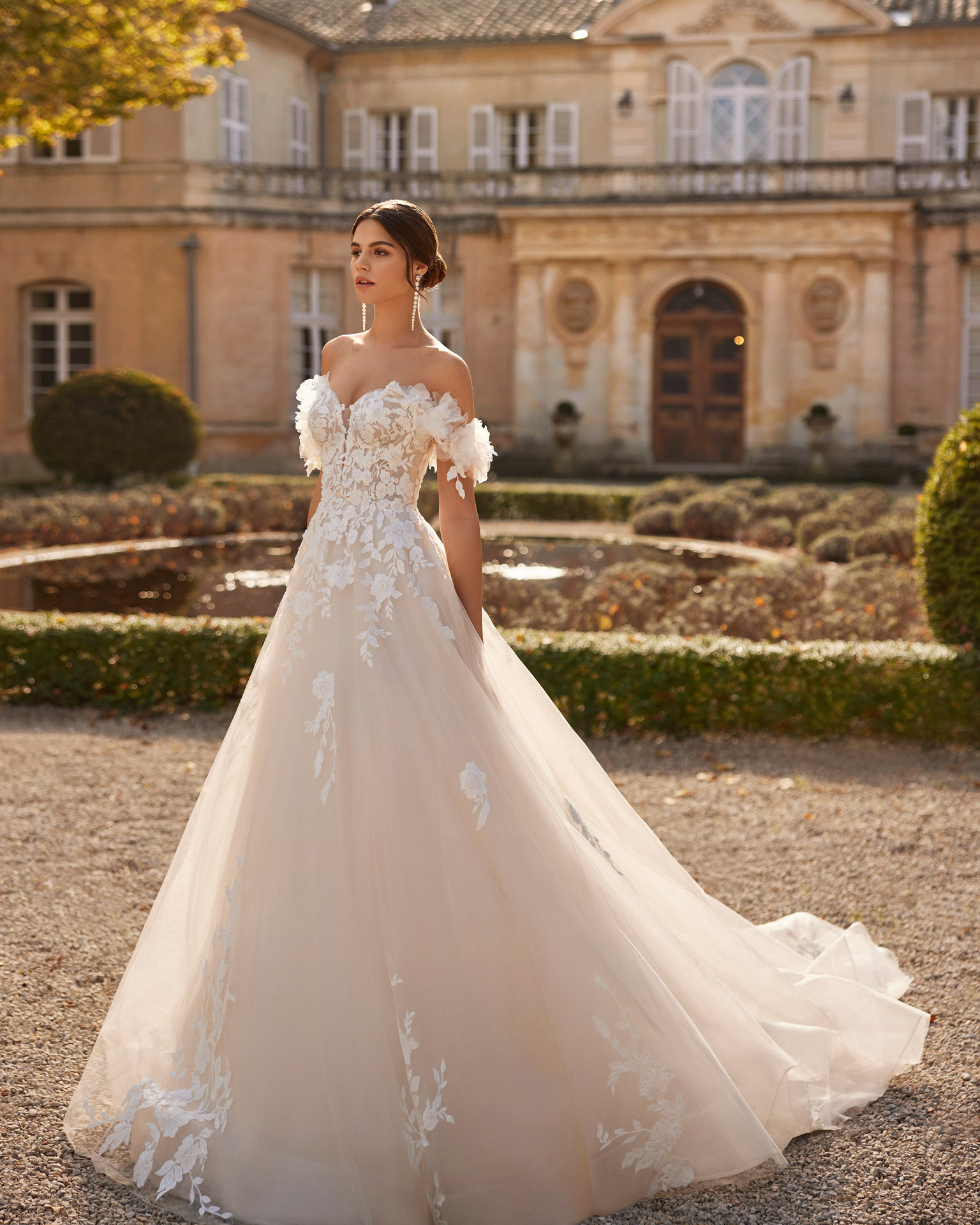 Robe de mariée ligne A en tulle avec dentelle et perles. Décolleté profond, bretelles fleuries et dos corset.