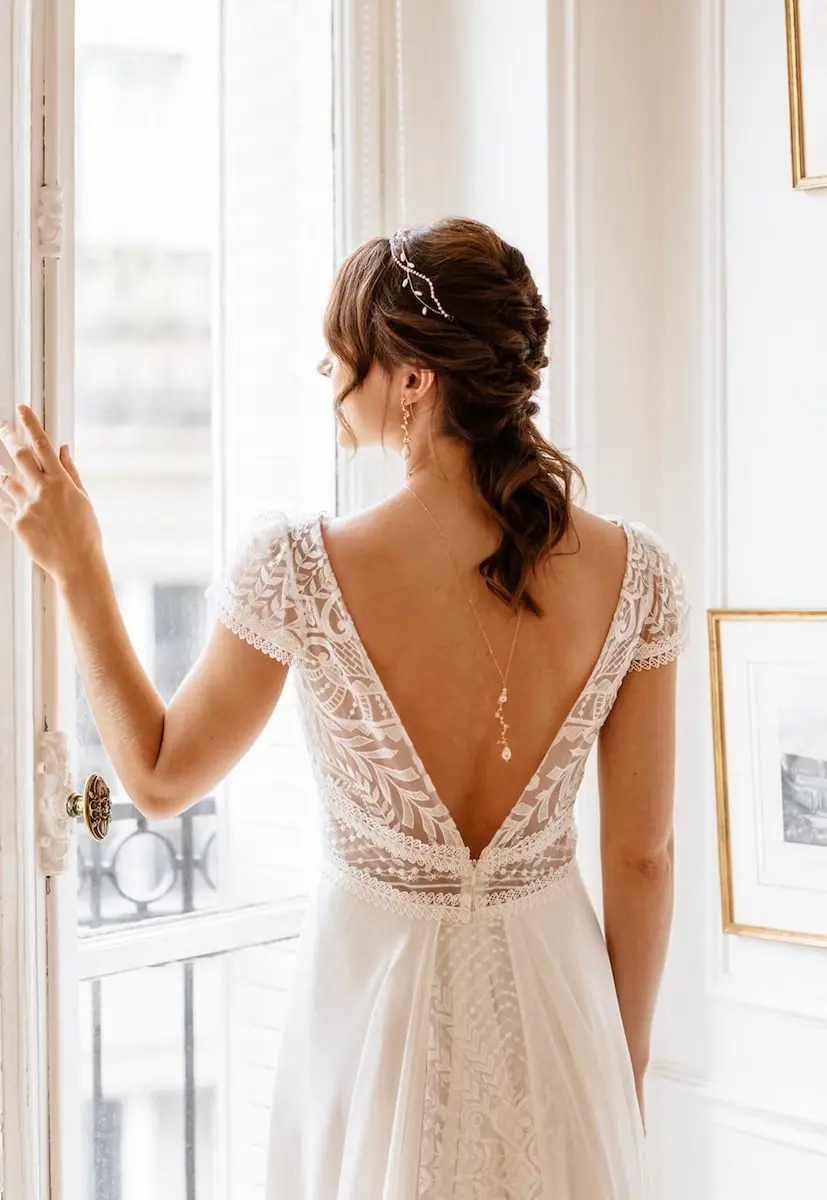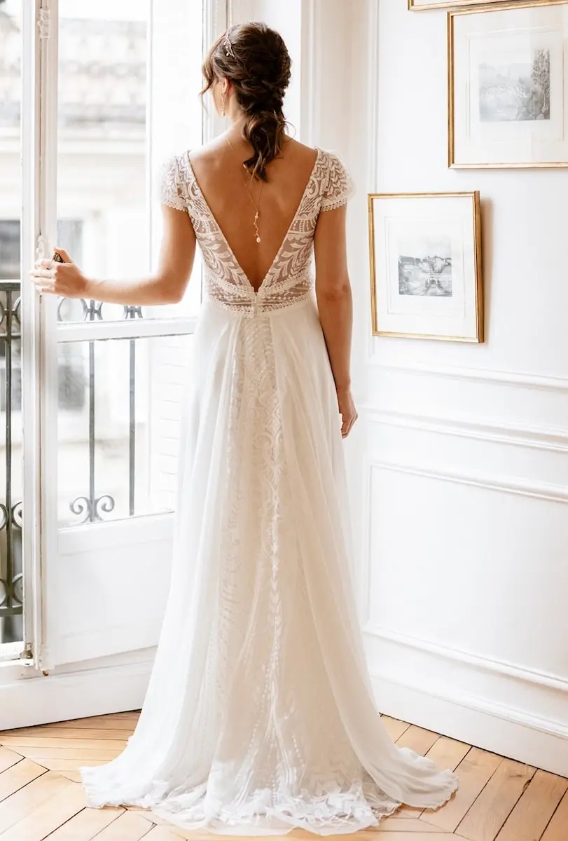 Victoire d’Elsa Gary, robe bohème et vintage avec petites manches, dentelle raffinée et jupe à quille pour une silhouette gracieuse et élégante.