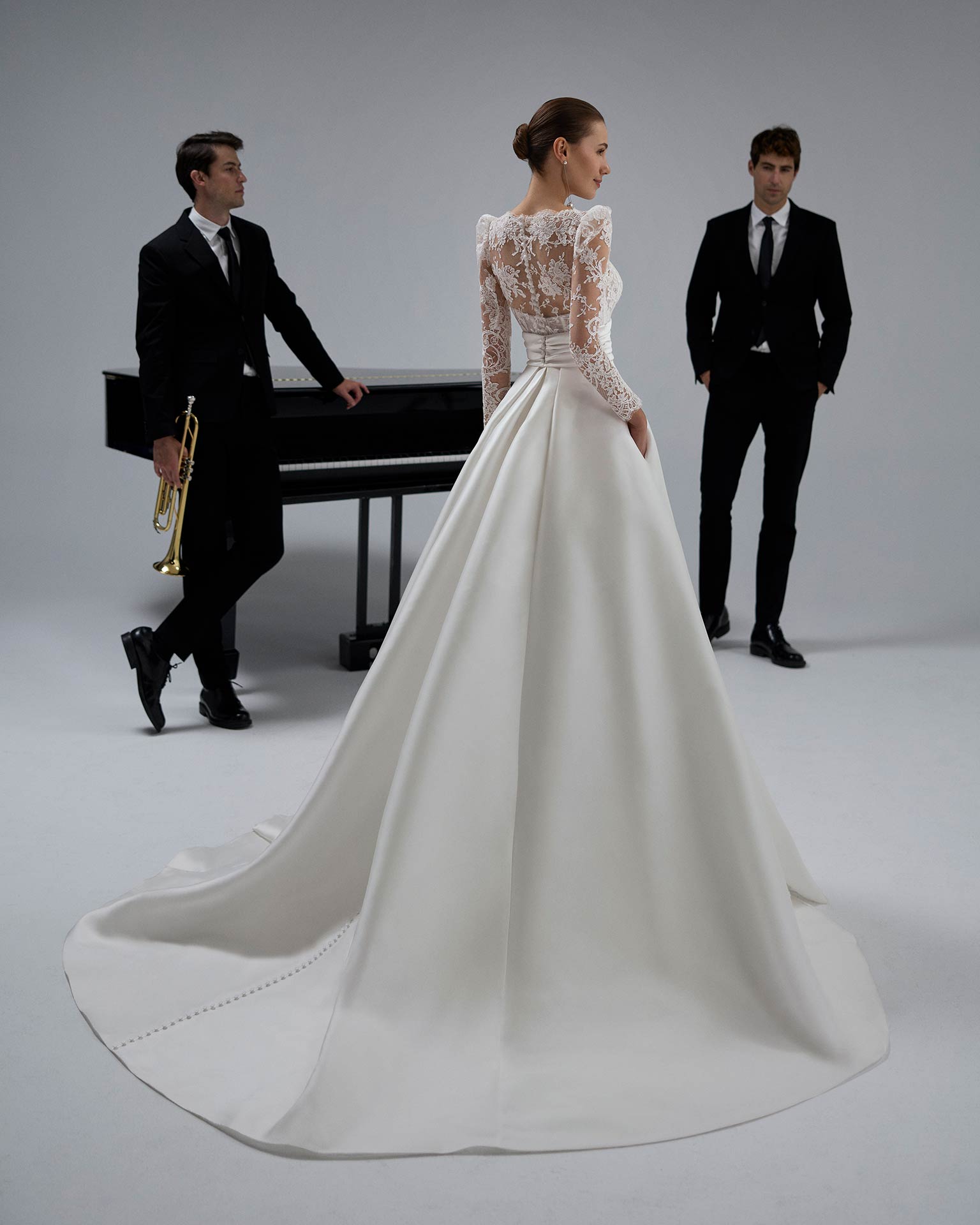 La jupe en Mikado magnolia, ample et fluide, dessine une ligne A harmonieuse qui allonge la silhouette et confère un port majestueux. Alliance parfaite entre tradition et modernité, cette création séduira la mariée en quête d’un style intemporel, à la fois chic, féminin et sophistiqué.